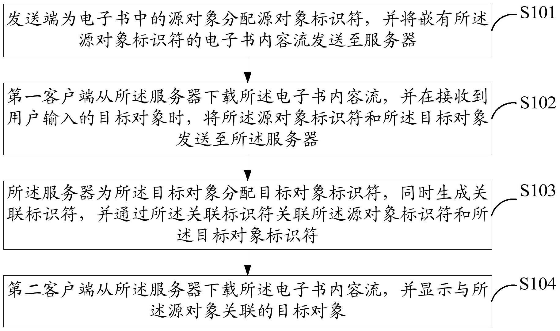 本发明公开了一种基于电子书的关联方法,包括以下步骤:发送端为电子书中的源对象分配源对象标识符,并将嵌有源对象标识符的电子书内容流发送至服务器;第一客户端从服务器下载所述电子书内容流,并在接收到用户输入的目标对象时,将源对象标识符和目标对象发送至服务器;服务器为目标对象分配目标对象标识符,同时生成关联标识符,并通过所述关联标识符关联源对象标识符和目标对象标识符;第二客户端从服务器下载电子书内容流,并根据嵌入电子书内容流内的源对象标识符显示源对象以及与源对象关联的目标对象。本发明还公开了一种系统。本发明可以使读者能够参与电子书内容的创造,从而提高移动终端基于电子书功能的多样性。