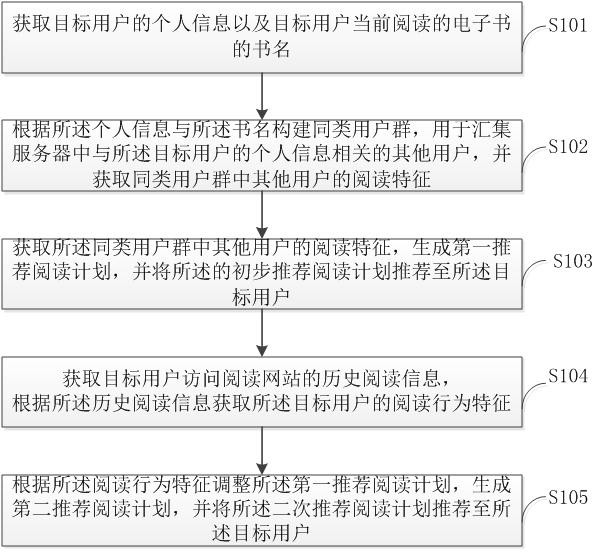 本发明公开一种电子书的阅读计划推荐系统及其方法,包括:获取目标用户的个人信息以及目标用户当前阅读的电子书的书名;根据个人信息与书名构建同类用户群,获取同类用户群中其他用户的阅读特征;获取同类用户群中其他用户的阅读特征,生成第一推荐阅读计划,并将第一推荐阅读计划推荐至目标用户;获取目标用户访问阅读图书的历史阅读信息,根据历史阅读信息统计出目标用户的阅读行为特征;根据阅读行为特征调整第一推荐阅读计划,生成第二推荐阅读计划,并将第二推荐阅读计划推荐至所述目标用户。无需用户设置,所有数据都基于用户的基本信息、用户阅读行为信息和个性化信息,迎合用户个性化需求。
