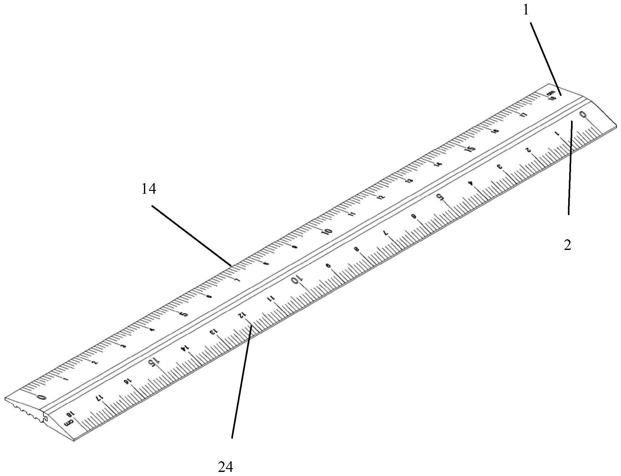 本发明提供一种能够以简单结构将金属部件与树脂部件牢固地卡合的尺子。尺子具有金属部件和树脂部件,在所述金属部件的一端形成有凸出部,在所述树脂部件的一端形成有与所述金属部件的突出部卡合的凹部。所述凸出部形成为前端比基端侧粗的形状,并沿长度方向连续延伸。所述金属部件以及所述树脂部件通过嵌件成型一体地形成。