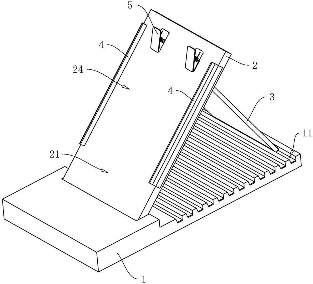 本申请涉及一种一种楔形焊锡治具,属于FPC板加工技术领域,其包括底座、承载件及支撑件,所述承载件铰接在所述底座上,所述承载件远离所述底座的一侧表面为承载面,所述承载面用于承载FPC板,所述支撑件的一端铰接在所述承载件上,并且所述支撑件位于所述承载件远离所述承载面的一侧;所述底座上设置有若干限位槽,若干所述限位槽间隔排列,所述支撑件远离所述承载件的一端用于插接在所述限位槽内。本申请具有提高FPC板加工的效率的效果。
