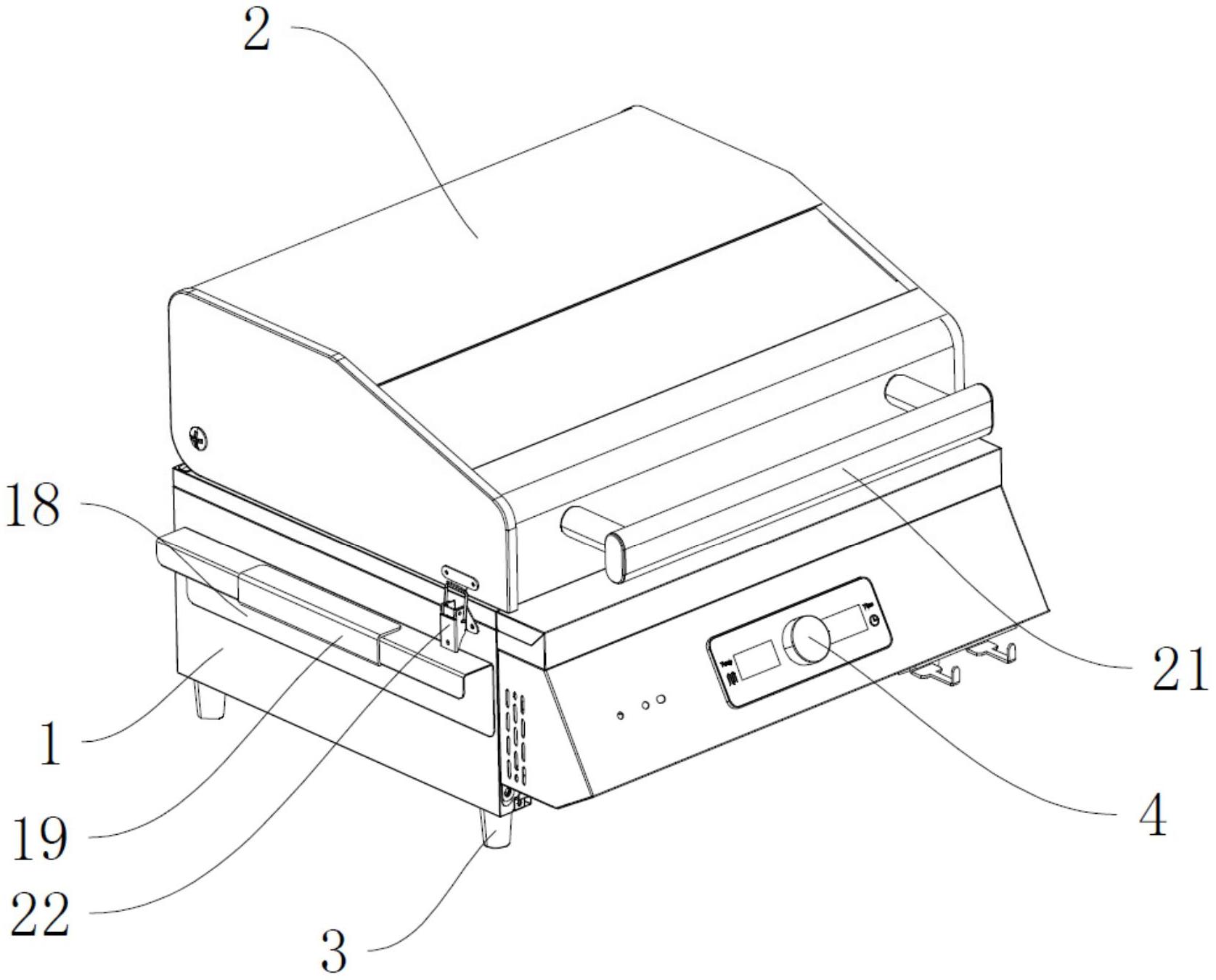 本实用新型所公开的一种具有全包围式导油结构的烧烤炉,包括炉体,炉体内设置有燃烧器和烤网,燃烧器位于烤网下方处,炉体内拆卸式连接有集油盘和导油结构,集油盘位于燃烧器的下方处,导油结构位于烤网和集油盘之间,炉体的内壁对称设置有两个第一支撑槽,导油结构包括前导油板和后导油板,前导油板的顶部和后导油板顶部均形成有卡入第一支撑槽的第一支撑部,前导油板与后导油板均设置有斜引导面。本实用新型进行维护清洁时,导油结构零部件少,拆装较为方便,用户可将前导油板和后导油板从第一支撑槽拆出,并将集油盘取出,使得集油盘、前导油板、后导油板可放入洗碗机中进行清洗,方便用户维护清洁该烧烤炉。