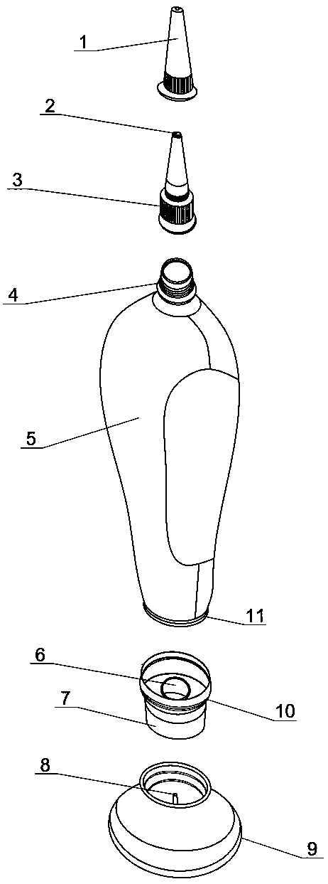 本实用新型涉及一种高粘度膏体挤压式软瓶,包括瓶身和瓶盖,瓶身采用聚乙烯或聚氯乙烯制成的空心结构;主要是瓶身两端分别设有上瓶口和下瓶口,瓶盖由上盖和下盖组成,上盖与上瓶口之间由螺纹相互密封连接,下盖上端与下瓶口之间由螺纹相互密封连接。利用不同出胶量和出胶方式的上瓶口和下瓶口,实现对不同使用对象的胶粘,具有密封性好,不易堵塞、使用性能可靠、使用范围大、适用性好、胶粘剂浪费少。适用于高粘度涂料、胶粘剂的包装软瓶。