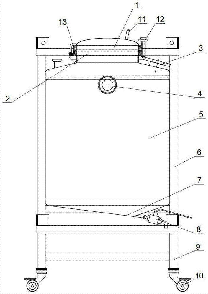 本实用新型涉及一种移动式胶粘剂易置罐,包括罐体和罐盖,罐盖顶部设有把手,罐盖一侧交接安装在罐体上端灌口的一侧,罐盖与罐口之间设有密封件,罐盖另一侧通过螺栓与罐口另一侧的螺孔相互锁紧配合;主要是罐体底部采用偏心锥底,在偏心锥底的底部安装出料阀;罐体安装于移动座架上,移动座架的安装面具有与罐体底部相互配合的偏心锥底,移动座架上部设有罐体防护框。具有密封性好,强度高,使用方便、安全、环保等特点。