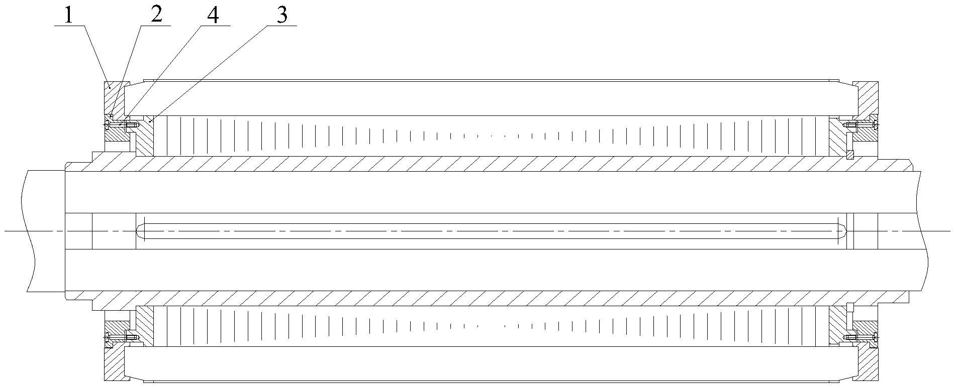 一种新型防爆电机铜条转子笼条防扭断装置包括由端环、支撑板、十字盘头螺钉、转子压圈组成,支撑板与转子压圈之间的连接采用十字盘头螺钉进行紧固,然后点焊牢固防止脱落;支撑板与端环采用过盈配合,使用热装工艺进行装配。原来的转子结构,不能保证转子笼条与端环同步运行,转子笼条与端环之间存在速度差,本实用新型采用的支撑板与转子压圈之间采用钢性连接,所以支撑板随转子压圈、转子笼条一起转动,同时由于支撑板与端环之间采用过盈配合,故支撑板带动端环随笼条一起转动,二者之间无速度差,实现同步运行,保证了电机的安全、可靠。