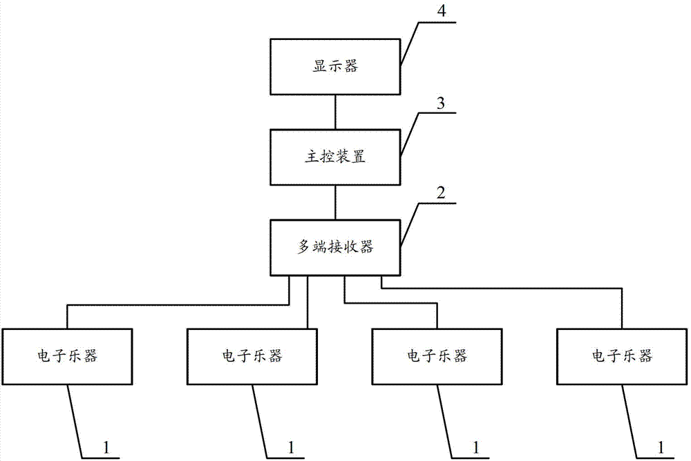 本实用新型属于音乐领域,具体为电子乐器信号的处理系统,能够实现对多台电子乐器同时演奏的信号进行处理。电子乐器信号的处理系统,包括:多台电子乐器,多端接收器,主控装置,显示器;所述多端接收器包括信号接收端子和信号输出端子;其中,所述多台电子乐器分别连接至所述多端接收器的所述信号接收端子,所述多端接收器的所述信号输出端子连接所述主控装置,所述主控装置连接所述显示器。所述主控装置包括:模式确定设备,评估设备;其中,所述模式确定设备与评估设备连接,所述评估设备分别连接所述显示器以及所述多端接收器的所述信号输出端子。
