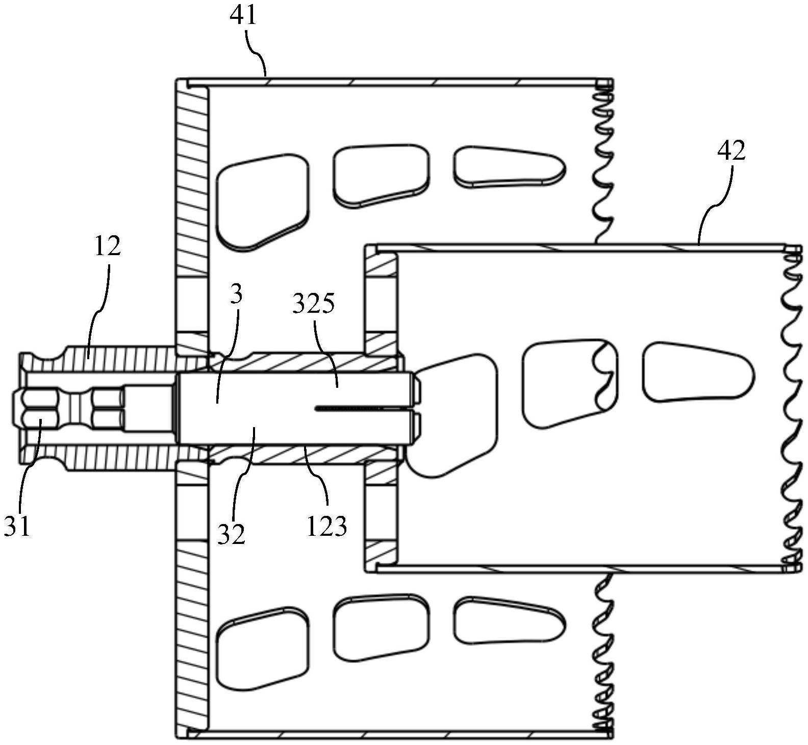 本申请涉及一种辅助件,所述辅助件用于将孔锯安装到驱动装置,所述孔锯包括适于供用于所述孔锯的定心钻穿过的轴向通孔,所述辅助件包括:安装部分,所述安装部分适于安装到所述驱动装置的定心钻接收部;固定部分,所述固定部分具有能膨胀的膨胀结构,所述膨胀结构适于通过膨胀而卡紧到所述孔锯的所述轴向通孔内。本申请还涉及相应的孔锯套件、工具系统和工具机系统。本申请的优点在于:能通过辅助件实现新型孔锯的扩孔功能并且辅助件的结构简单且使用方便。