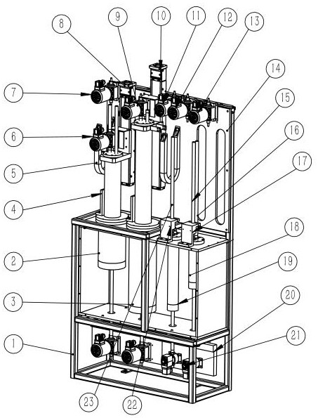 本实用新型公开了一种用于金刚石砂的自动加液设备,包括机架,所述机架上表面的后侧固定安装有安装基板,所述机架的左右两侧均固定安装有挡板,所述安装基板的正面左侧安装有第一排气电磁阀,所述第一排气电磁阀的下侧设置有第一进液电磁阀。该用于金刚石砂的自动加液设备,通过第一伺服模组和第二伺服模组带动活塞在活塞缸体内运动的使用,使得实现加液速度和加液量的精确控制功能,控制往罐体内加液是否已满,通过在保温箱体内填满保温棉,并在第一罐体、第二罐体周围缠绕伴热带和安装温控探头,可以起到对第一罐体和第二罐体内的液体加热和保温作用。