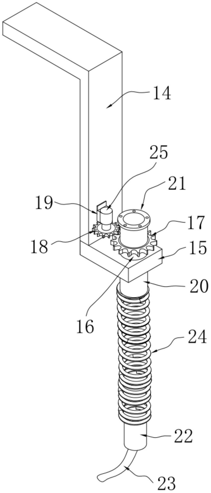 本实用新型公开了一种人造草坪专用烘干机上胶装置,包括行进机构以及上胶机构,所述行进机构上的伺服减速电机驱动横向丝杆转动,带动移动座以及安装台左右移动,移动座以及安装台左右移动时,同样带动了上胶机构的左右移动,上胶套筒通过接料口连接胶筒出料管,上胶套筒底部通过上胶管与上胶嘴接通,方便上胶,回转电机驱动小齿轮转动,大齿轮啮合小齿轮,带动上胶套筒回转,上胶嘴左右移动的过程中,可以在齿轮啮合作用下进行前后移动,由此完成上胶嘴从左到右移动过程中,在人造草坪的背面喷成连续的V形胶道,喷胶均匀,方便调胶挡板的均匀布胶。