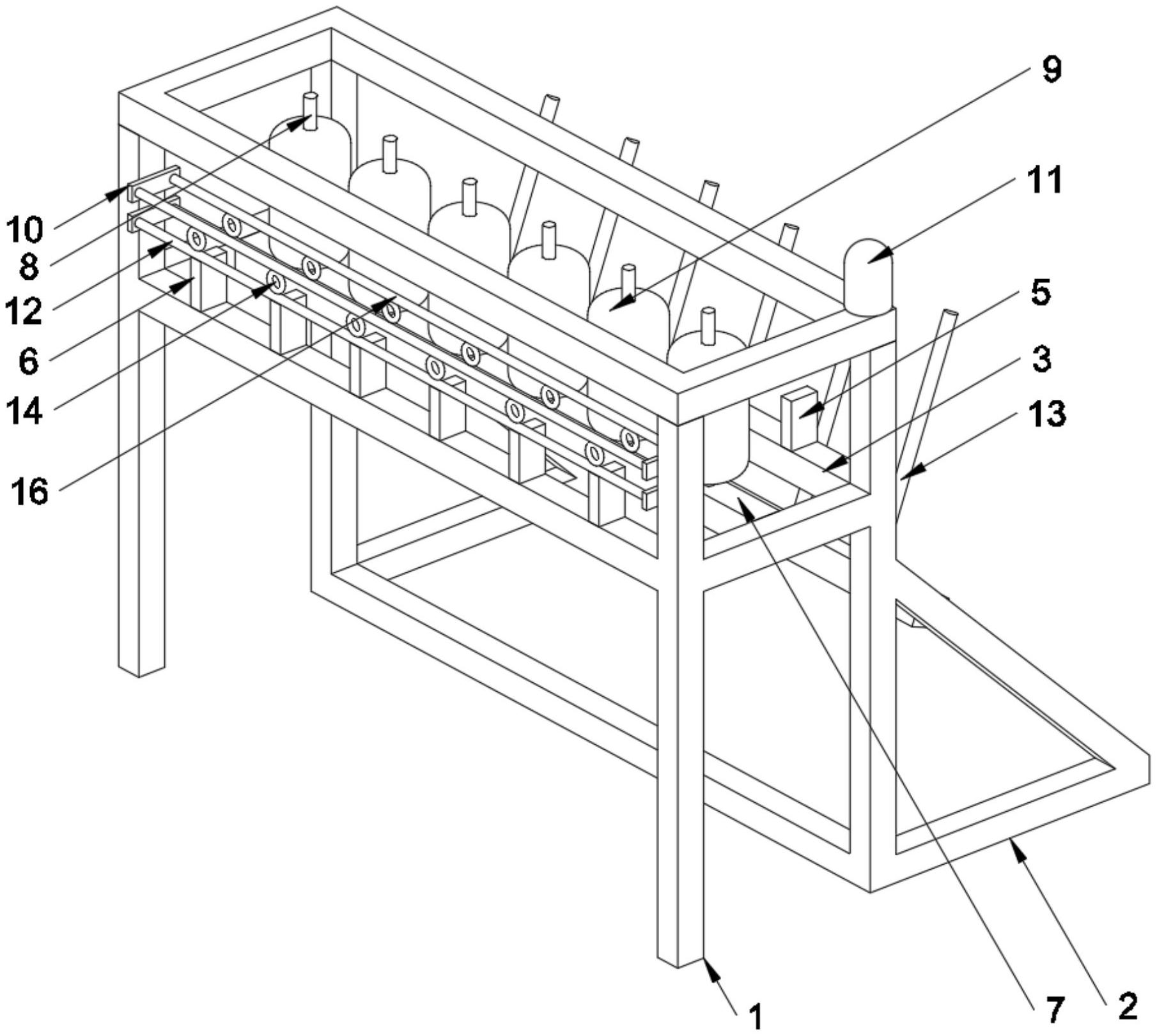 本实用新型属于监控装置技术领域,具体涉及人造草坪织机纱线监控装置,包括前固定架和后固定架,前固定架上侧固定安装有上固定架和上横杆,上固定架上前后对称安装有光电开关发射端和光电开关接收端,上横杆顶面上转动安装的固定杆上活动安装有纱线筒,前固定架内侧安装的固定块侧面连接有前连接架和后连接架,前连接架和后连接架的中间均连接有引线环,前固定架顶端安装有声光警报器,后固定架内侧连接的下横杆上安装有预置杆,当纱线筒上的纱线不能遮挡光电开关发射端的光轴时,光电开关接收端接收到光电开关发射端的光轴并通过声光警报器发出声音警报,提醒操作人员前来更换纱线筒,引线环可避免纱线剐蹭到光电开关接收端而造成纱线的崩断。