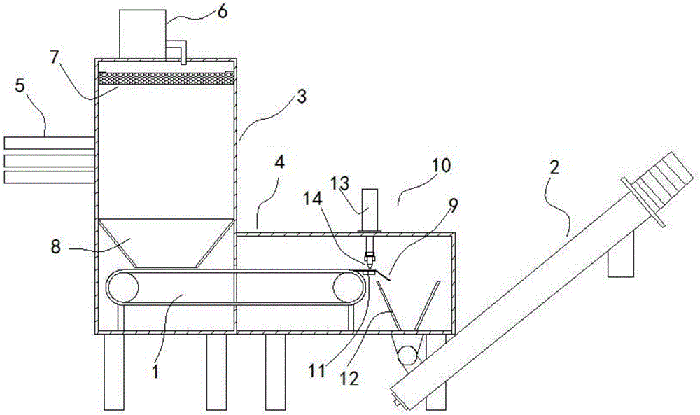 本实用新型公开了一种废丝回收装置,涉及草纤维废料回收技术领域。本实用新型包括水平输送机、螺旋输送机,还包括收集箱、与收集箱侧面连接的粉碎箱;收集箱侧面固定连通有多个进气管;收集箱与粉碎箱之间开有连通通道;收集箱上端面固定有引风机;引风机进气口通过管道与收集箱内部上端连通;收集箱内壁上端部安装有过滤网板;收集箱内壁且位于进气管下侧固定有聚料漏斗;水平输送机一端设置在聚料漏斗下侧;水平输送机另一端穿过连通通道至粉碎箱内部。本实用新型通过设计的水平输送机、水平输送机、收集箱、粉碎箱、分切板和往复分切装置组成回收生产线废料的装置,增加的废料再利用环节节能环保,解决了现有人造草丝纤维废料的问题。