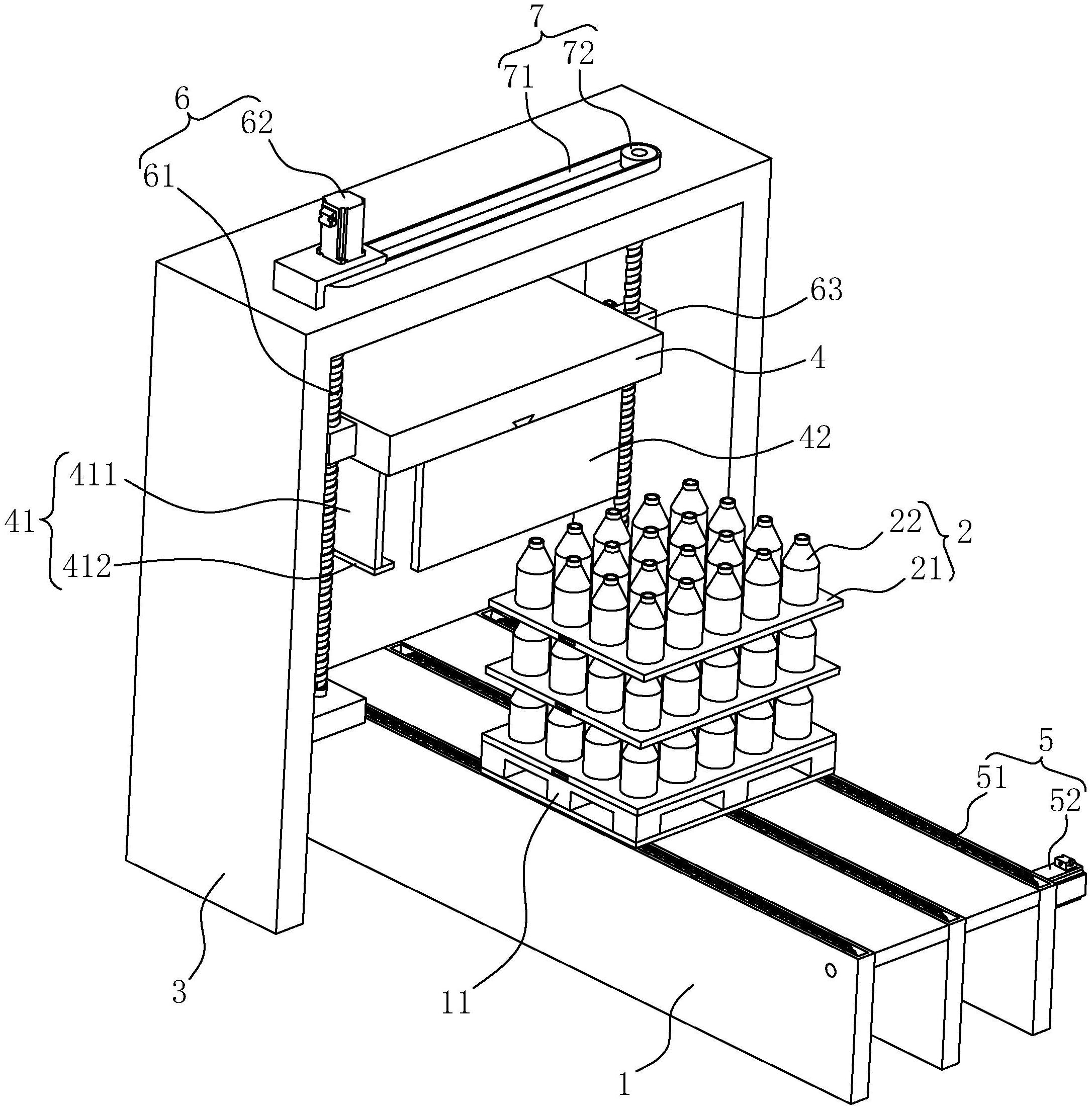 本申请涉及食品加工的领域,尤其是涉及一种空瓶推送装置,包括上料架,所述上料架上沿水平方向滑动设置有承载底座,所述承载底座上堆叠有若干层空瓶组。所述上料架的一端设置有转料架,所述转料架上沿竖向滑动设置有升降座,所述升降座上滑动连接有两个夹板。所述升降座上滑动连接有推板,所述推板位于两个所述夹板之间,所述推板的滑动方向平行于所述承载底座的滑动方向,所述推板用于将两个所述夹板之间的所述空瓶组推向装瓶输送线。本申请具有批量自动输送空瓶的效果,进而提高了料酒的装瓶效率。