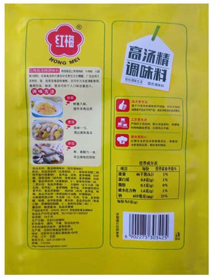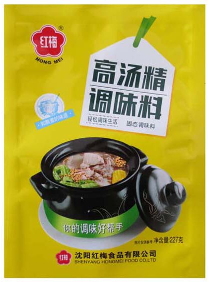 1.本外观设计产品的名称:包装袋(高汤精调味料)。2.本外观设计产品的用途:本外观设计产品用于装调料的包装袋。3.本外观设计产品的设计要点:在于产品的整体形状。4.最能表明本外观设计设计要点的图片或照片:主视图。