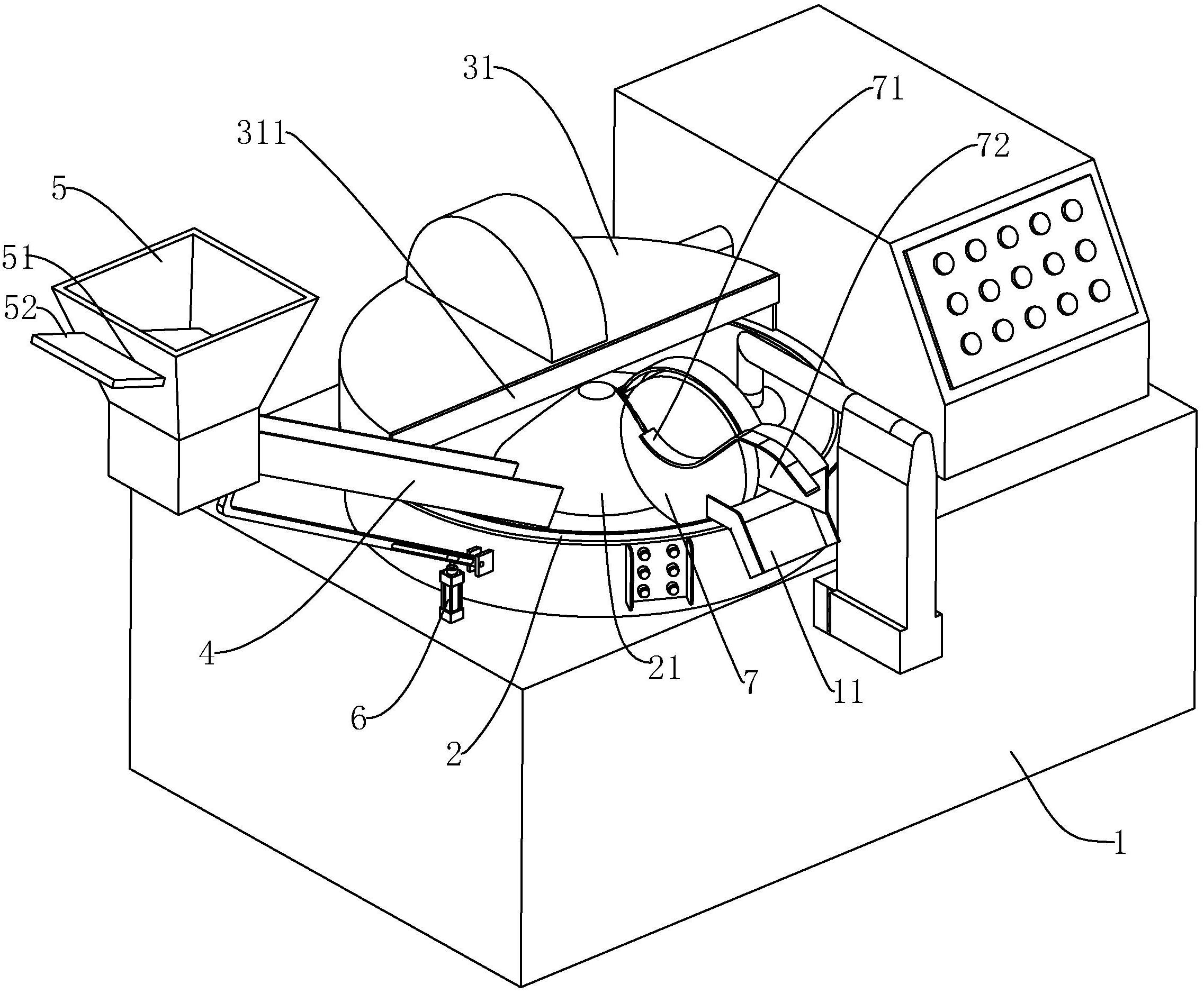 本实用新型涉及一种多用型斩拌机,其包括操作台以及相对操作台转动的转锅,所述操作台的一侧设有向外延伸有倾斜设置的上料槽,所述上料槽位于转锅的上方,且上料槽靠近转锅的一端低于上料槽远离转锅的一端,所述上料槽较低一端伸入转锅内。本实用新型具有方便上料并使辅料均匀落入转锅内的效果。