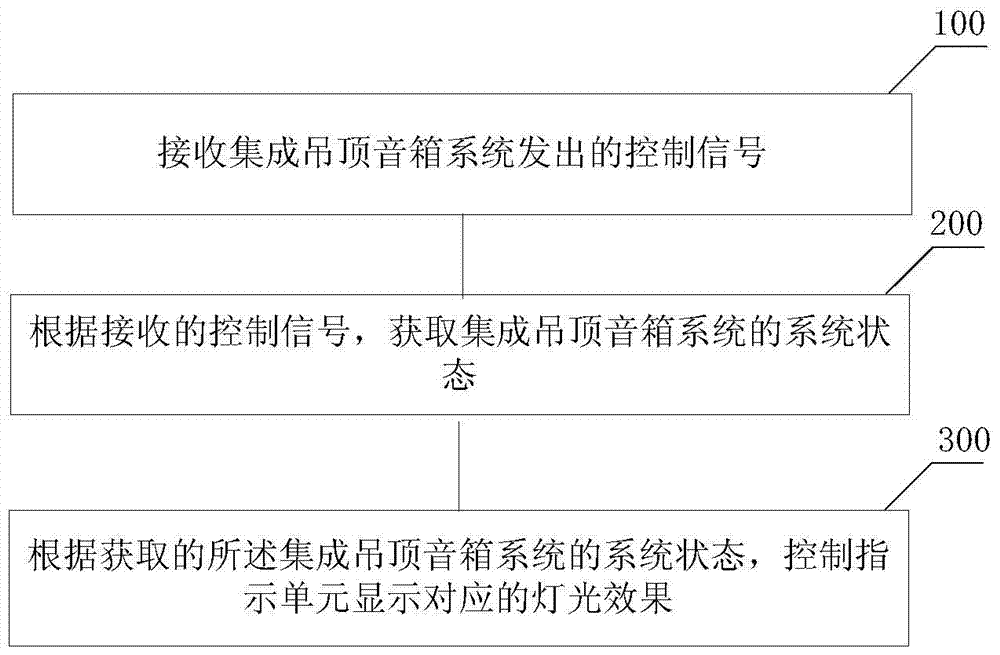 本发明公开了一种集成吊顶无线背景音乐灯光指示方法和系统,该集成吊顶无线背景音乐灯光指示方法,应用于集成吊顶无线背景音乐指示系统中,该集成吊顶无线背景音乐指示系统的硬件包括控制器、LED驱动器和指示单元,控制器用于根据吊顶音箱系统发出的控制信号控制LED驱动器驱动指示单元,以显示对应的吊顶音箱系统的系统状态,该方法通过接收集成吊顶音箱系统发出的控制信号;根据接收的控制信号,获取集成吊顶音箱系统的系统状态;根据获取的集成吊顶音箱系统的系统状态,控制指示单元显示对应的灯光效果。本发明解决了集成吊顶音箱系统的状态指示问题,并增加了吊顶的美观度和提高了整体显示效果。