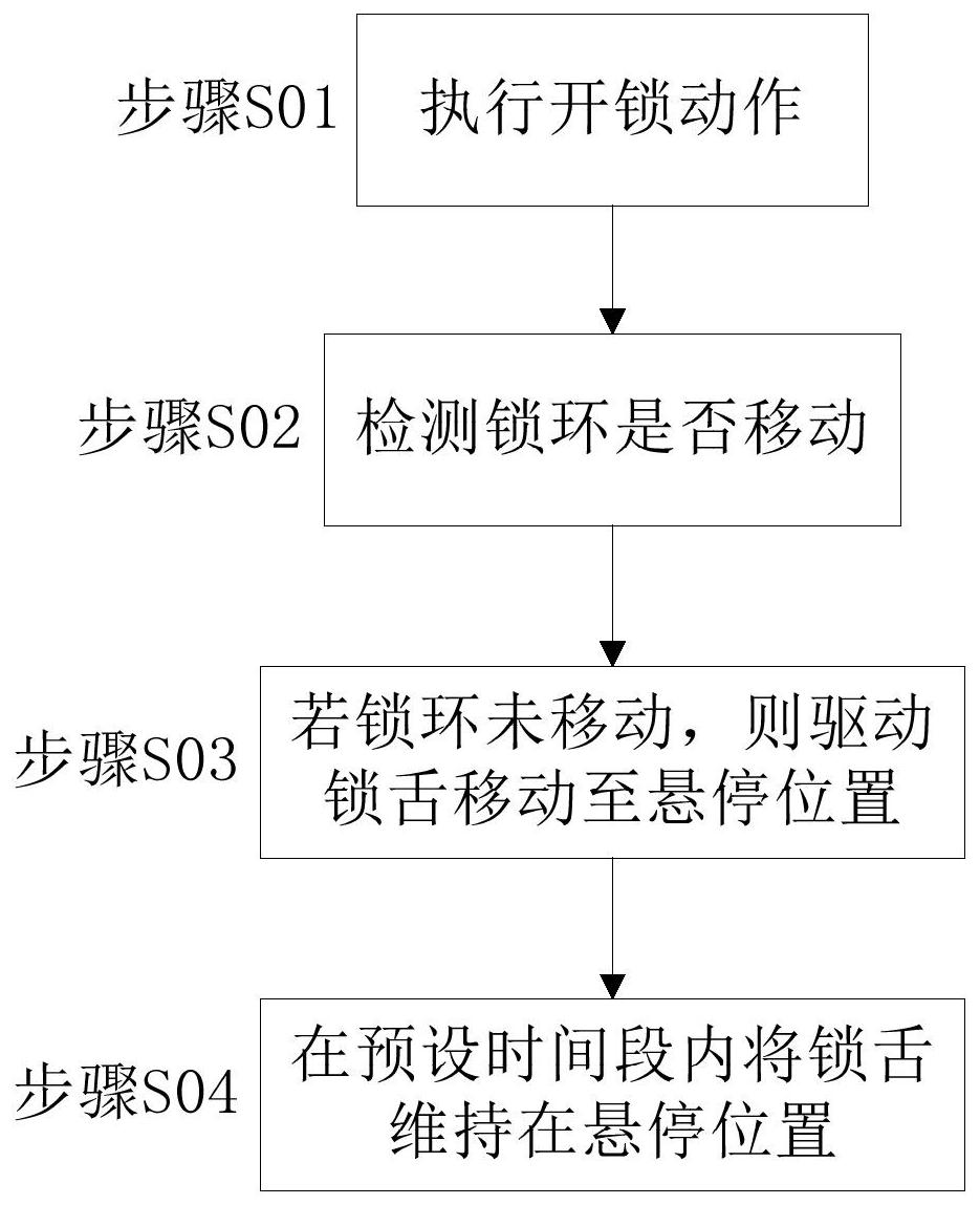 本发明提供了一种锁具、车辆及车辆的开锁方法。该开锁方法包括以下步骤:执行开锁动作;检测锁环是否移动;若锁环未移动,则驱动锁舌移动至悬停位置;在预设时间段内将锁舌维持在悬停位置。本发明的开锁方法可解决开锁时锁环停滞不动的问题。