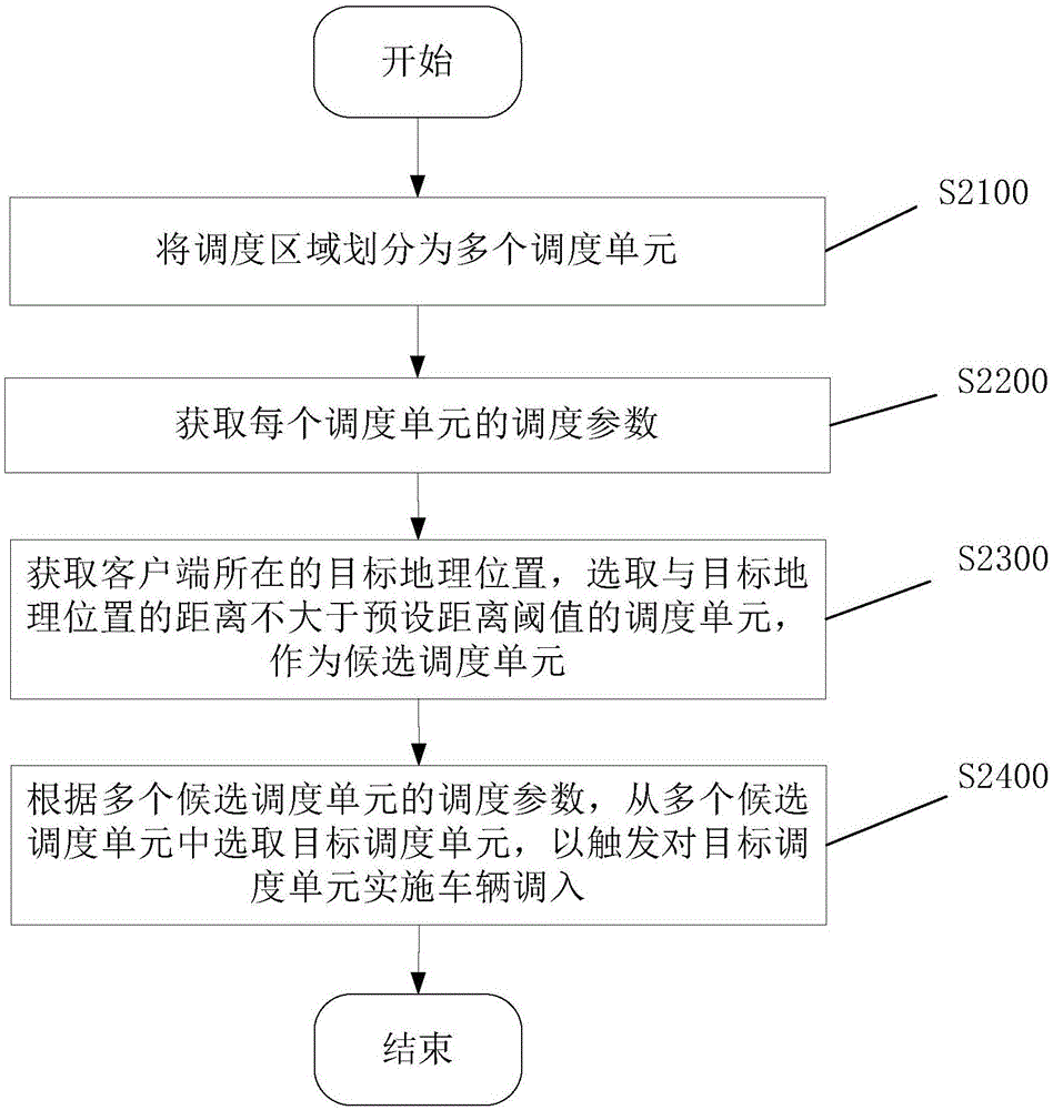 本发明公开了一种车辆调度方法、服务器、客户端及系统。该方法包括:将调度区域划分为多个调度单元;获取每个所述调度单元的调度参数;获取客户端所在的目标地理位置,选取与目标地理位置的距离不大于预设距离阈值的调度单元作为候选调度单元;根据多个候选调度单元的调度参数,从多个候选调度单元中选取目标调度单元,以触发对目标调度单元实施车辆调入。根据本发明,实现结合调度区域内的实时供需数据以及实时调度状态,选取能实施有效的车辆调入的地点,提升调度效率。