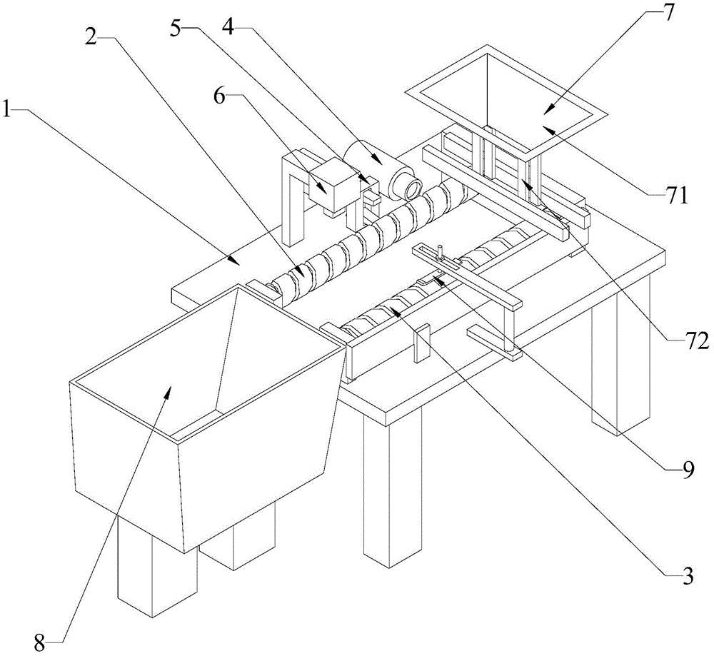本实用新型涉及竹筷加工设备技术领域,特别涉及一种竹筷激光雕刻装置;包括基座、第一输送螺杆、第二申输送螺杆、摄像头、气动夹爪和激光雕刻机,通过步进电机带动两条输送螺杆同步转动,实现竹筷激光雕刻的自动输送,通过摄像头和启动夹爪的配合,实现了竹筷的位置调节,使竹筷的雕刻面朝上,输送螺杆可以较为密集地排列竹筷,配合竹筷下料机构,可以实现竹筷高效且精准的图案雕刻,不需要人工进行理料,节约了大量工时和人工成本,提高了工作效率,由于工人不需要将手直接放置在激光雕刻机的下方,因此提高了生产的安全性。