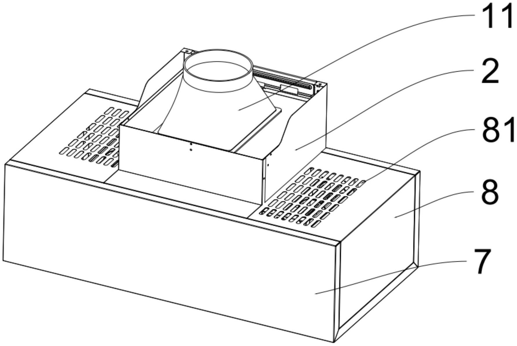 本实用新型公开了一种新式吸油烟机,包括:集烟腔、箱体、风道、分流板和风机,集烟腔呈漏斗形,集烟腔设置有上口和下口,下口面积大于上口面积,箱体为底部开放的中空结构,箱体底部连通集烟腔的上口,风道为沿中心线弯曲的中空方管,风道的中心线为弧线,扇环形风道的内弧面为第一端面,风机设置于箱体外部靠近进风口处,风道的第二端面靠近集烟腔的上口,分流板的两端为顶端和底端,分流板能够在风道内分隔出两块区域,两块区域在分流板的顶端连通,分流板与过滤孔的最小距离大于零,分流板的顶端与第一端面内壁的垂直距离小于分流板底端距离第一端面内壁的垂直距离。本实用新型能耗低、吸烟效果好和避免风机受到油烟污染。