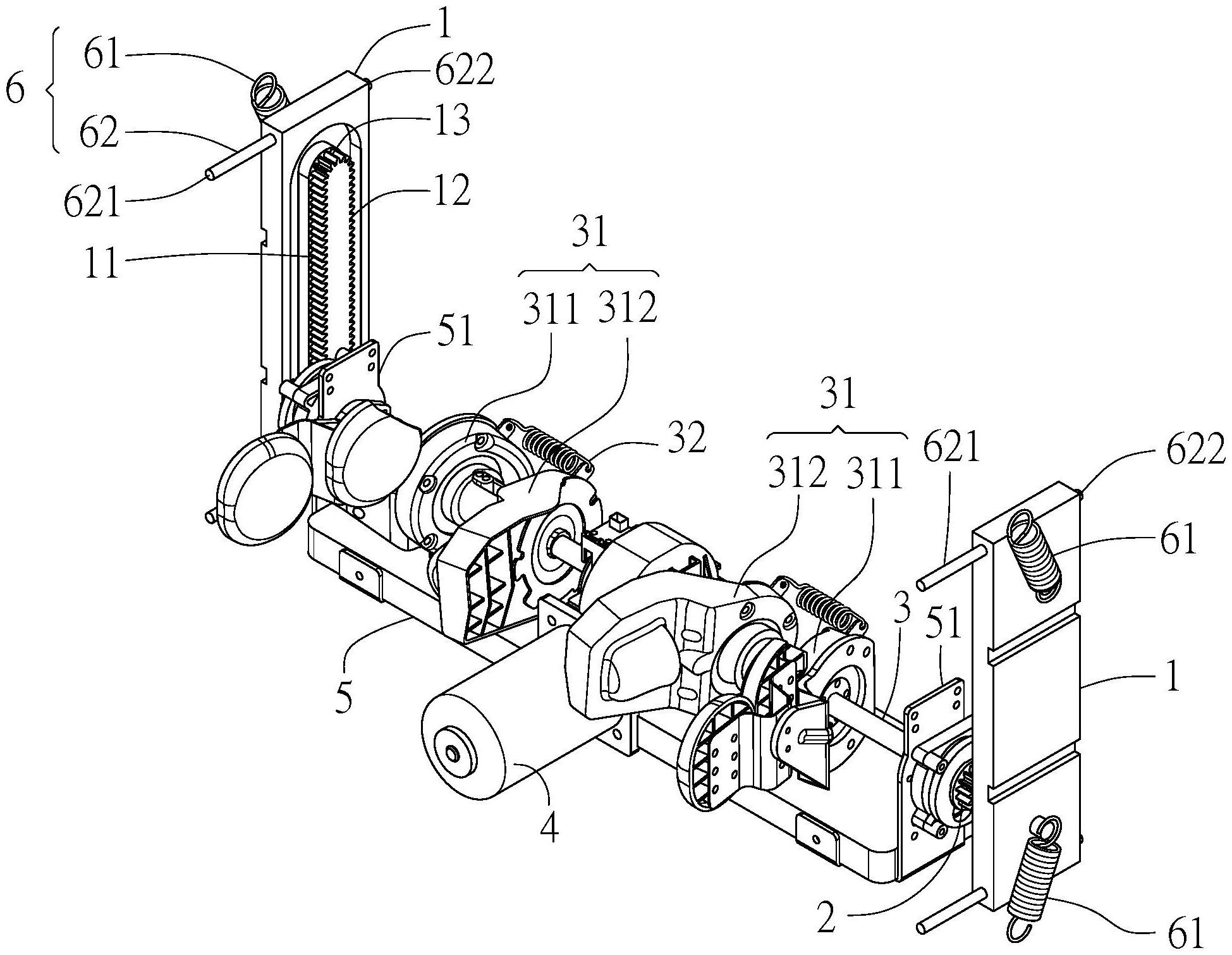 一种按摩装置的机芯轨道结构,具有二轨道座,二轨道座分别设有一环形轨道,环形轨道包括有一第一轨道、一第二轨道及二分别连通第一轨道及第二轨道的连通道,二移动件分别设于该二轨道座的其中一环形轨道上,二移动件分别相对其对应的轨道座移动,一轴杆的两端分别组设其中一移动件并与对应的环形轨道相连接,该轴杆接设有至少一摆臂,以及一驱动件接设于轴杆上,用以驱动轴杆旋转并带动移动件沿着第一轨道或第二轨道上、下移动;当移动件由该第一轨道或第二轨道移动至连通道时,该移动件可由第一轨道经连通道移至第二轨道而与第二轨道呈对正设置或由第二轨道经连通道移至第一轨道而与第一轨道呈对正设置。