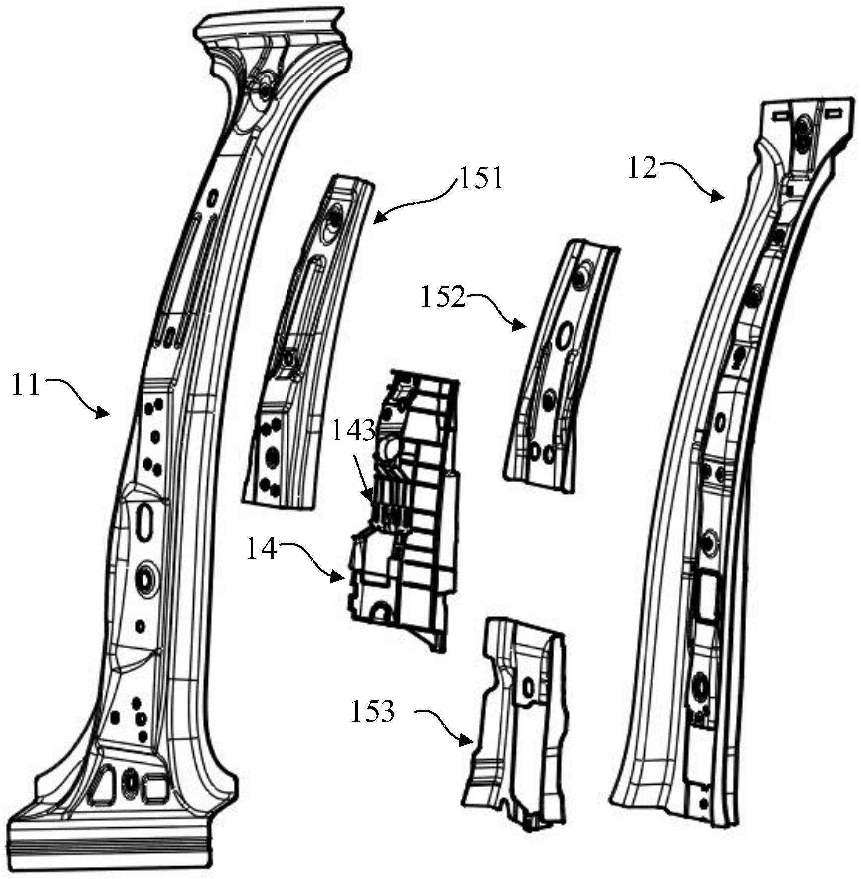 本实用新型属于车辆技术领域,旨在解决现有车辆的抗侧碰性能不足的问题。本实用新型提供了一种车辆及其B柱组件,B柱组件包括外板和内板以及设置在二者围成的空腔内的增强构件,增强构件包括基体以及在基体两侧靠近两端的连接部,基体两侧的连接部分别与外板的内侧和内板的外侧连接,基体与外板之间中间段形成有避让空间。在B柱组件受到撞击时,增强构件与外板之间形成避让空间使外板能够先发生局部变形吸收部分冲击能,之后通过增强构件、外板以及内板的整体变形,使B柱组件既能产生适量的形变吸能,又能够避免变形过大断裂导致侵入量过大损伤驾乘人员的情况,提高了B柱组件1的抗侧碰性能。