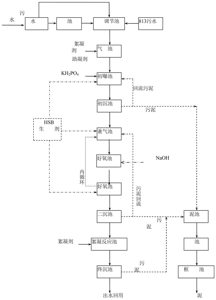 本发明提供一种混合型化肥生产废水生化处理方法,具体步骤是将混合型废水经过格栅除去大块漂浮物后进入集水井,缓存、配水、吹脱、均化、加入助凝剂和絮凝剂再进入初曝池;初曝池中投加高效微生物制剂HSBEMBMR,加磷酸二氢钠以补充营养物质P,去除混合型废水中抑制脱氮菌属的有毒有害物质;初曝池出水自流至初沉池,初沉池出水自流至兼气池、好氧池、多功能池进行脱氮、脱碳处理阶段,其中,初曝池中投加高效微生物制剂HSBEMBMR;多功能池出水至二沉池,进行泥水分离,出水达标后跨越絮反终沉池至清水池排放经处理后打入终沉池,终沉池出水自流至清水池排放或回用。该类废水处理后回用于厂区的循环水系统,回用率达到85%以上,环境效益和经济效益显著。