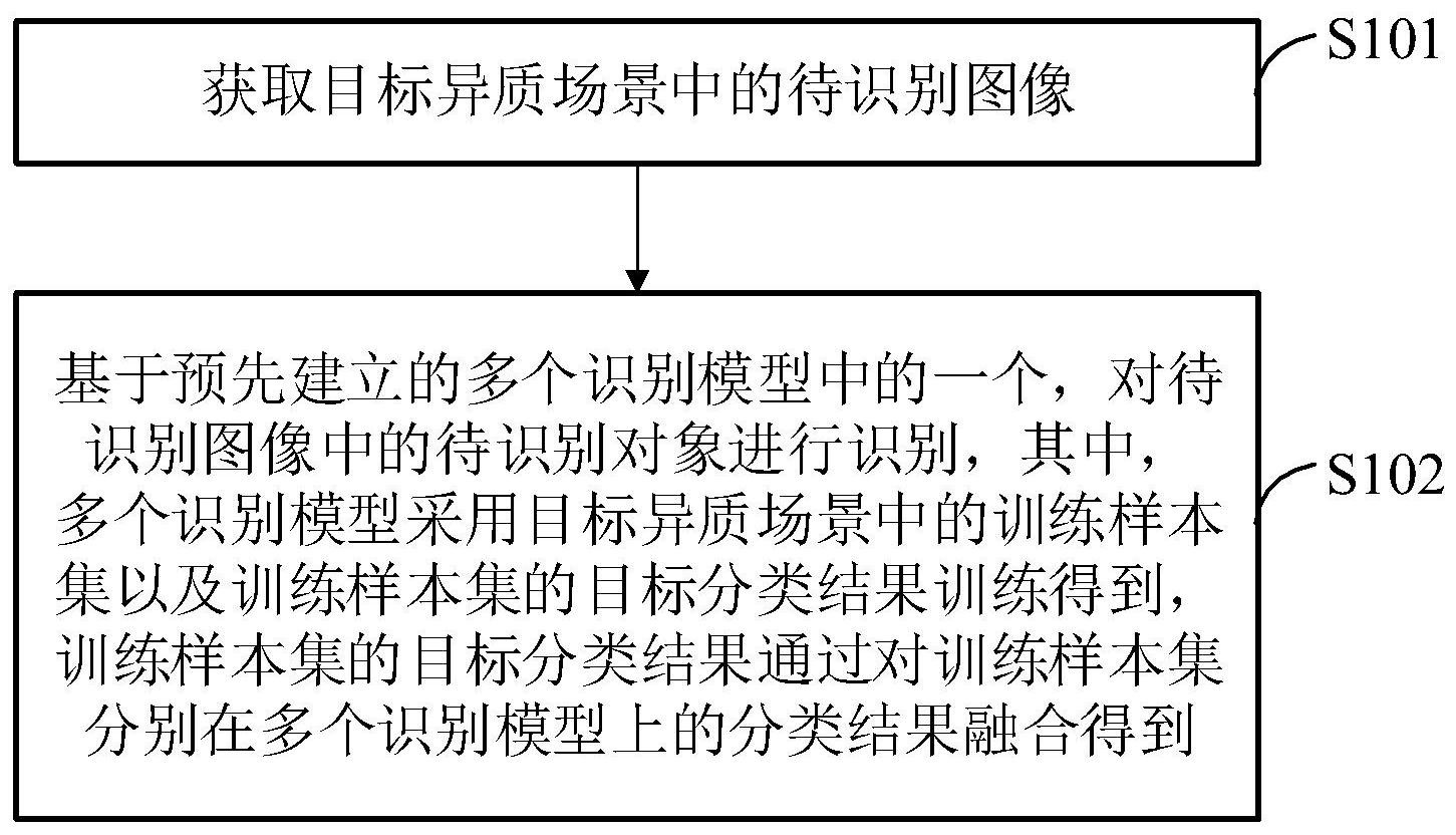 本申请提供了一种对象识别方法、装置、设备及存储介质,其中,识别方法包括:获取目标异质场景中的待识别图像;基于预先建立的多个识别模型中的一个,对待识别图像中的待识别对象进行识别,多个识别模型采用目标异质场景中的训练样本集训练得到,每个识别模型根据对应的预测损失进行参数更新,每个识别模型对应的预测损失根据训练样本集的目标分类结果确定,训练样本集的目标分类结果通过对训练样本集分别在多个识别模型上的分类结果融合得到,训练样本集在一识别模型上的分类结果根据从该识别模型针对训练样本集中每个样本确定的特征表示向量中提取的唯一性特征向量确定。本申请提供的对象识别方法对目标异质场景中的图像具有较好的识别效果。
