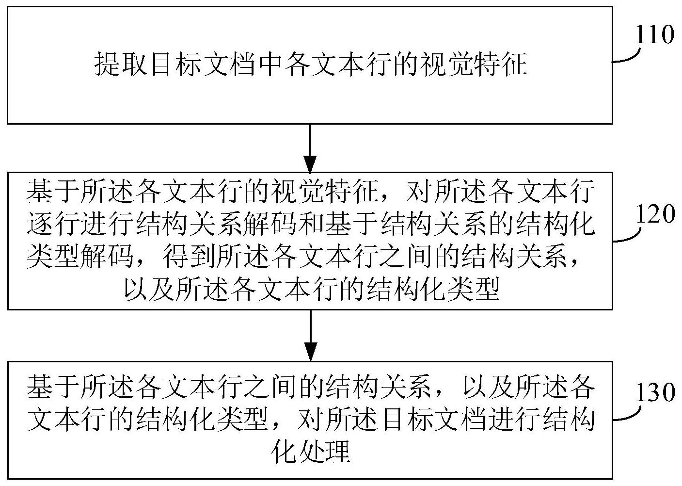 本发明提供一种文档结构化方法、装置、电子设备和存储介质,所述方法包括:提取目标文档中各文本行的视觉特征;基于各文本行的视觉特征,对各文本行逐行进行结构关系解码和基于结构关系的结构化类型解码,得到各文本行之间的结构关系,以及各文本行的结构化类型;基于各文本行之间的结构关系,以及各文本行的结构化类型,对目标文档进行结构化处理。本发明基于目标文档中各文本行的视觉特征,确定各文本行之间的结构关系以及各文本行的结构化类型,并基于各文本行之间的结构关系,以及各文本行的结构化类型,对目标文档进行结构化处理,使得结构化处理后的目标文档能够准确表征有各文本行之间的空间结构信息,鲁棒性较高。