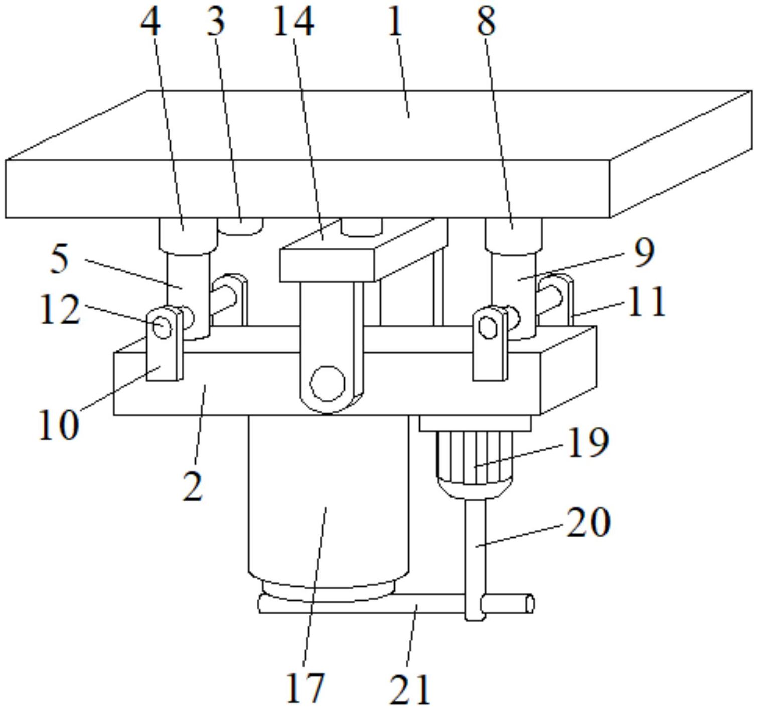 本实用新型公开了一种可调节的视频监控器,包括墙板、摆动板和摄像头,墙板底部设置有摆动板,墙板底部一侧设置有伸缩电机,伸缩电机的一端设置有伸缩套杆,伸缩套杆的输出端连接有第一伸缩杆,墙板底部另一侧设置有伸缩柱,伸缩柱的输出端连接有第二伸缩杆,摆动板上靠近第一伸缩杆和第二伸缩杆均焊接有第一固定板,摆动板上靠近第一伸缩杆和第二伸缩杆的另一端均焊接有第二固定板,摆动板底部靠近中间位置处安装有摄像头,摆动板底部另一端设置有第二底板,第二底板上安装有电机,电机的输出端连接有旋转轴,旋转轴上另一端设置有毛刷杆。有益效果:本实用新型通过摆动板摆动使得摄像头的角度可以自由调节,摄像头可以有较广的拍摄范围。