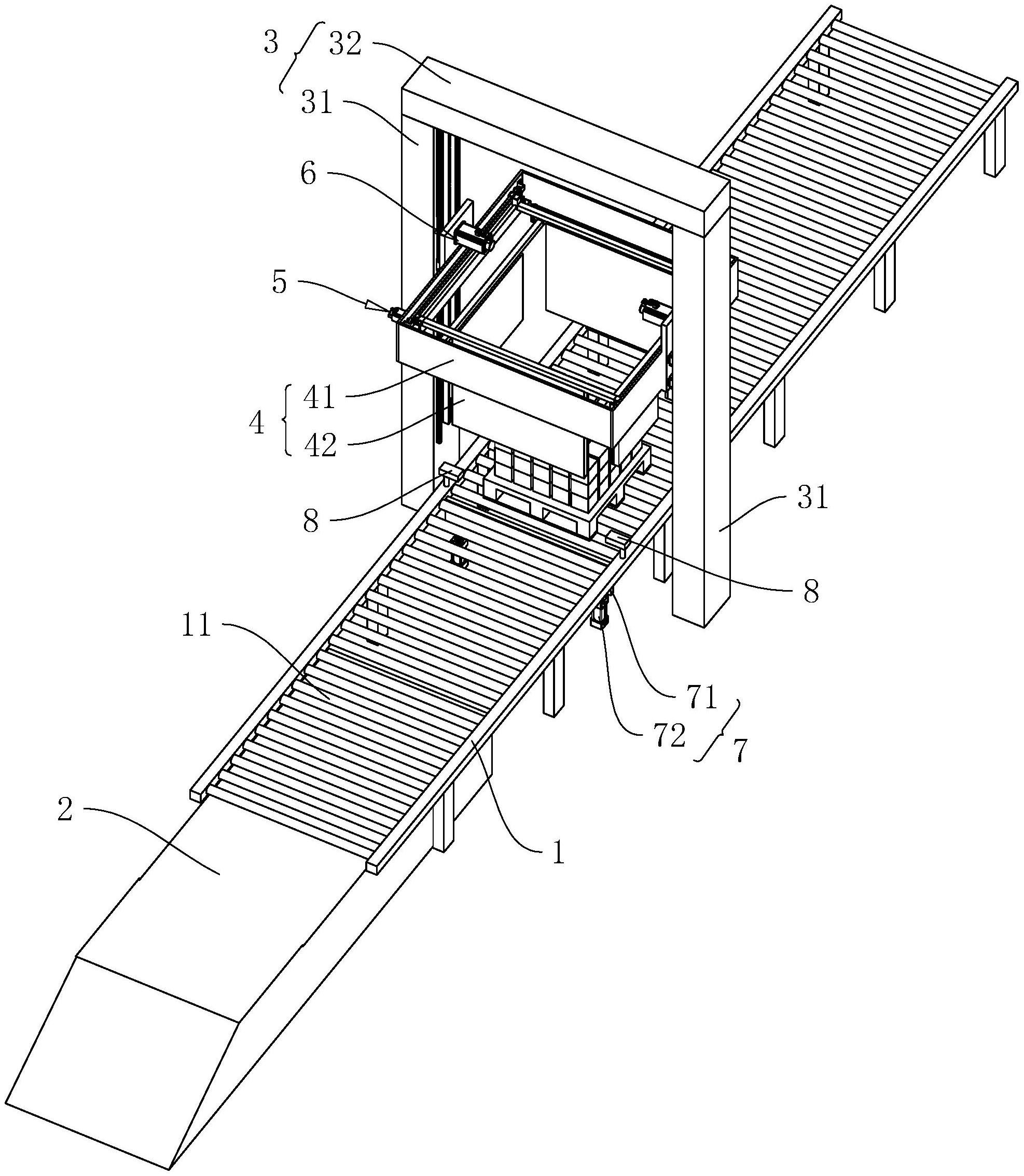 本申请涉及一种用于鱼饵包装箱的自动码放装置,涉及包装箱码放相关机械设备的领域,其包括输料传送带、堆放台以及对正机构,输料传送带由多个相互平行的输送辊及安装于地面上的输送机架构成,用于对托板及托板上的包装箱堆进行传送,以输料传送带的上料端为前端,输料传送带前端与码垛机相连接,堆放台连接于输料传送带后端,对正机构位于输料传送带中部,用于对托板上的包装箱堆进行聚拢对正;本申请中的自动码放装置通过对正机构与输料传送带配合,能够较为方便的实现对托板上的包装箱堆的传运输送以及聚拢对正,提高包装箱堆码放的整齐性和稳定性。