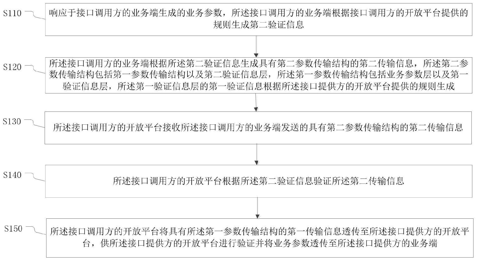 本发明提供一种开放平台对接方法、装置、设备以及存储介质,方法包括:响应于生成业务参数,根据接口调用方开放平台提供的规则生成第二验证信息;根据第二验证信息生成具有第二参数传输结构的第二传输信息,第二参数传输结构包括第一参数传输结构以及第二验证信息层,第一参数传输结构包括业务参数层以及第一验证信息层,第一验证信息层的第一验证信息根据接口提供方开放平台提供的规则生成;接口调用方开放平台接收具有第二参数传输结构的第二传输信息并根据第二验证信息验证第二传输信息,将具有第一参数传输结构的第一传输信息透传至接口提供方开放平台,供接口提供方验证并将业务参数透传至接口提供方业务端。本发明实现开放平台的对接。