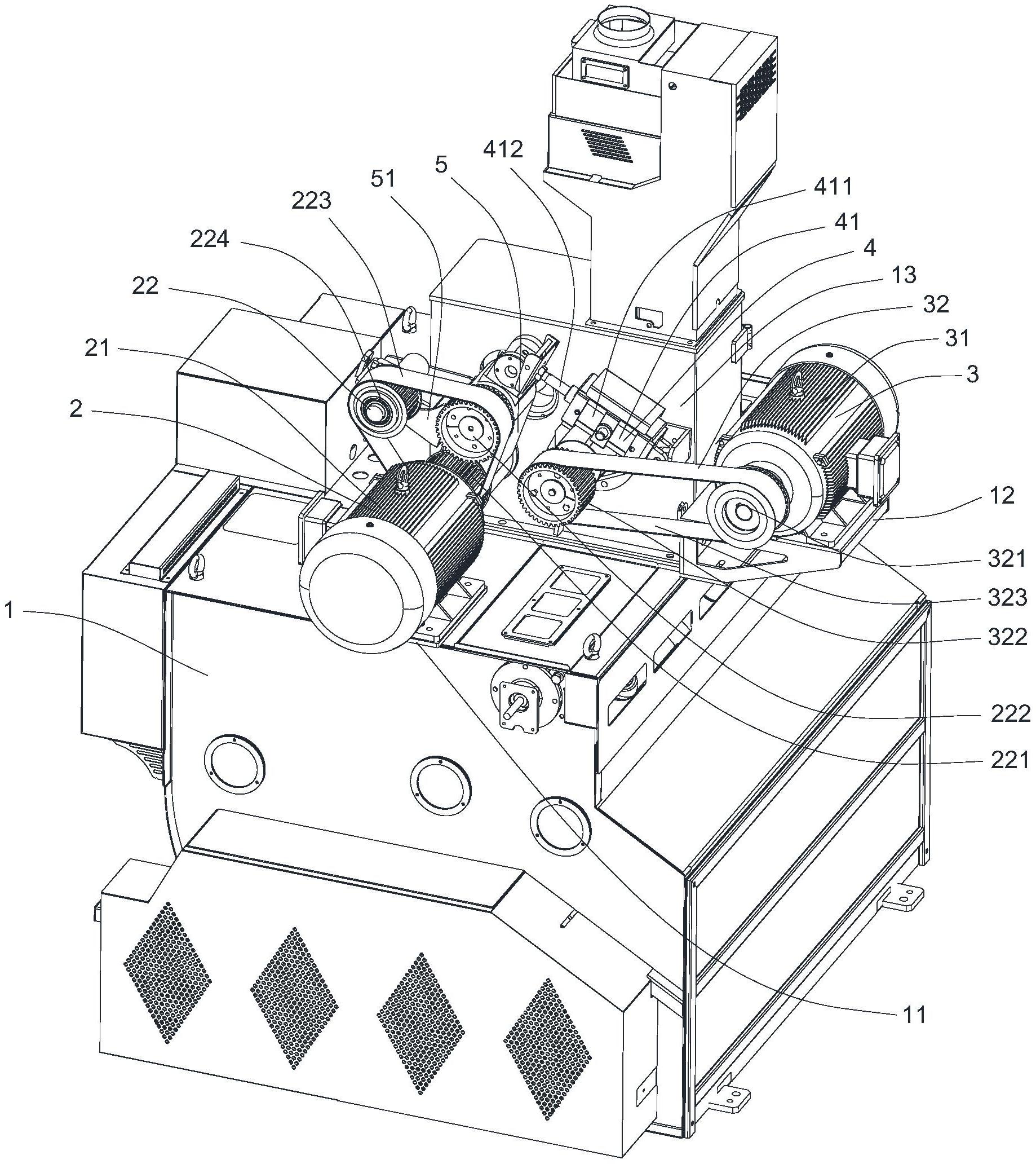 本实用新型公开了一种砻谷机,包括机架、机头座、摆动辊和固定辊,以及用于驱动摆动辊旋转的第一驱动机构、用于驱动固定辊旋转的第二驱动机构、用于带动摆动辊摆动地靠近或远离固定辊的摆动机构,所述砻谷机还包括摆臂,摆臂的第一端与机头座铰接,摆动辊设于摆臂的第二端,摆动机构与摆臂连接并用于驱动摆臂带动摆动辊摆动,所述第一驱动机构包括第一电机和第一传动组件,第一传动组件与摆动辊连接并用于在第一电机的驱动下带动摆动辊旋转,第一电机的输出轴沿摆臂在机头座上的铰接轴线的延长线设置。本实用新型提供的砻谷机的摆动辊在摆动时,第一电机与摆动辊之间的间距保持不变,有效简化传动结构,减少合辊阻力,结构更加简单高效。