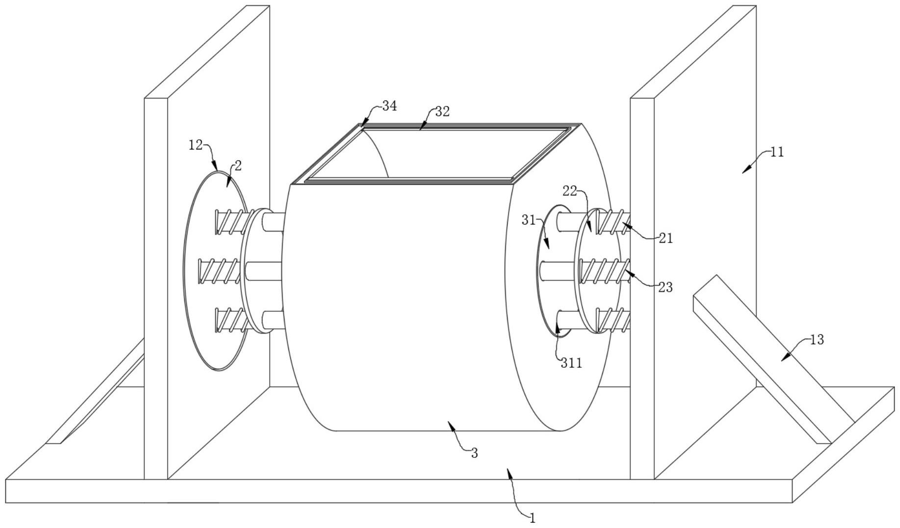 本实用新型属于石膏压滤产后输送技术领域,尤其为一种石膏输送结构,包括底板,两个所述外转板之间固定连接有支撑杆,所述底板上方设有储料箱,所述储料箱内壁铰接有两个环形块,两个所述环形块之间固定连接有若干个固定杆,若干个所述固定杆一端可拆卸连接有刮板;通过外转板、支撑杆和内转板组成能够使储料箱处于支撑杆上进行滑动和转动的组件,储料箱能够进行来回的滑动和转动,并且在储料箱不停的滑动和转动时,石膏细粉同样会不停的晃动,再通过环形块和刮板能够对储料箱内的石膏细粉进行刮式。