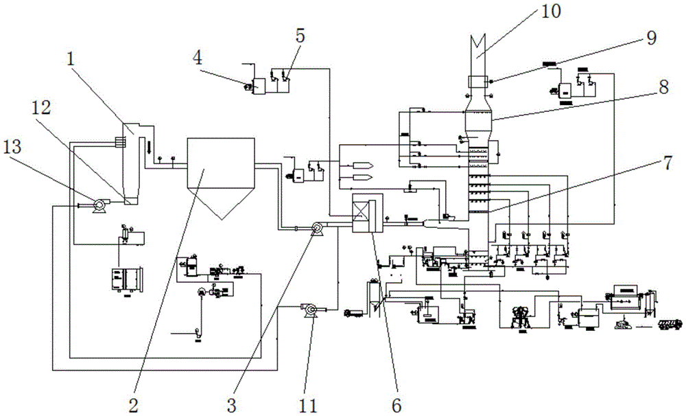 本发明公开了一种脱硫脱硝除尘一体化技术的研制,采用以下主要设备及组合方式,主要设备包括燃煤锅炉、布袋除尘器、主引风机、亚氯酸钠储槽、亚硫酸钠输送泵、脱硝氧化活化装置、脱硫脱硝除尘一体化塔、超级除尘除雾装置、在线监测仪、直排烟囱、低氧燃烧循环风机、锅炉炉膛和锅炉鼓风机,并通过特定的工艺设备组合方式组合,本方案通过布袋除尘器装置去除99.9%以上的尘经引风机加压后进入特殊设计的脱硝氧化活化装置,将95%以上NO在此转化为高价氮,而后进入脱硫脱硝除尘一体化装置,脱硫脱硝后的烟气经过上部超级除尘除雾后有直排烟囱排放,实现脱硫脱硝除尘一体化,实现超低排放,利于环境的保护。