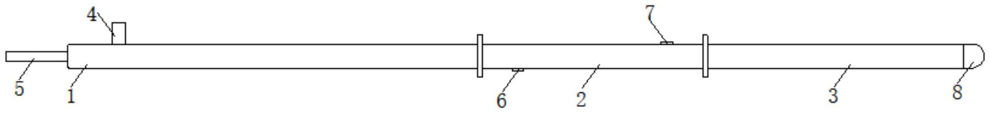 本实用新型提供一种加长多喷头喷枪,包括:第一喷枪主体;第二喷枪主体,所述第二喷枪主体设置于所述第一喷枪主体的一侧;第三喷枪主体,所述第三喷枪主体设置于所述第二喷枪主体的一侧;空气入口,所述空气入口设置于所述第一喷枪主体外表面顶部的一侧;脱硝剂入口,所述脱硝剂入口设置于所述第一喷枪主体的另一侧;脱硝剂第一喷口,所述脱硝剂第一喷口设置于所述第二喷枪主体外表面底部的一侧;脱硝剂第二喷口,所述脱硝剂第二喷口设置于所述第二喷枪主体外表面顶部的一侧。本实用新型提供的加长多喷头喷枪,使得脱硝剂经过加长多喷头多点喷入高温区进行强化SNCR脱硝反应,提升了各种窑炉的SNCR脱硝效果,降低了运行成本。