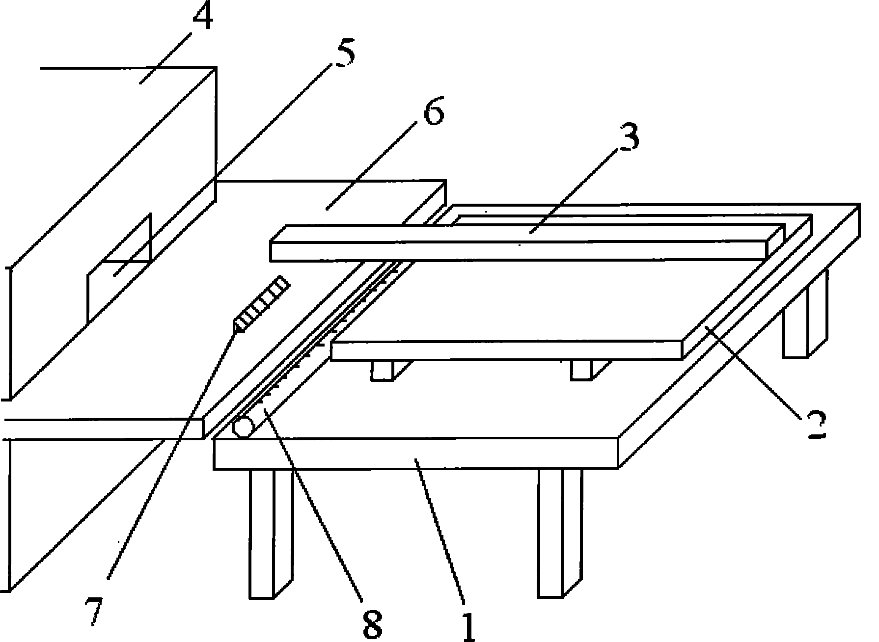 本实用新型公开了一种开直边机的送料装置,包括有底架,底架上设有水平送料台,水平送料台的一侧设有校直块;还包括有开直边机,开直边机的进料口处设有过渡平台,过渡平台与水平送料台相对接,校直块向前延伸至过渡平台上,过渡平台上设有一排可上下浮动的挡块;底架的前端设有水平标尺,水平标尺位于水平送料台的下方且与水平送料台相垂直。本实用新型结构简单,在开直边机的进料口之前设置水平送料台和校直块,在水平方向和竖直方向对竹板进行校正,有效的保证了开直边机的加工精度;另外,本实用新型在水平送料台的下方设置水平标尺,以便对竹板的实际尺寸做即时参考,保障了竹板的尺寸精度,具有很好的实用价值。