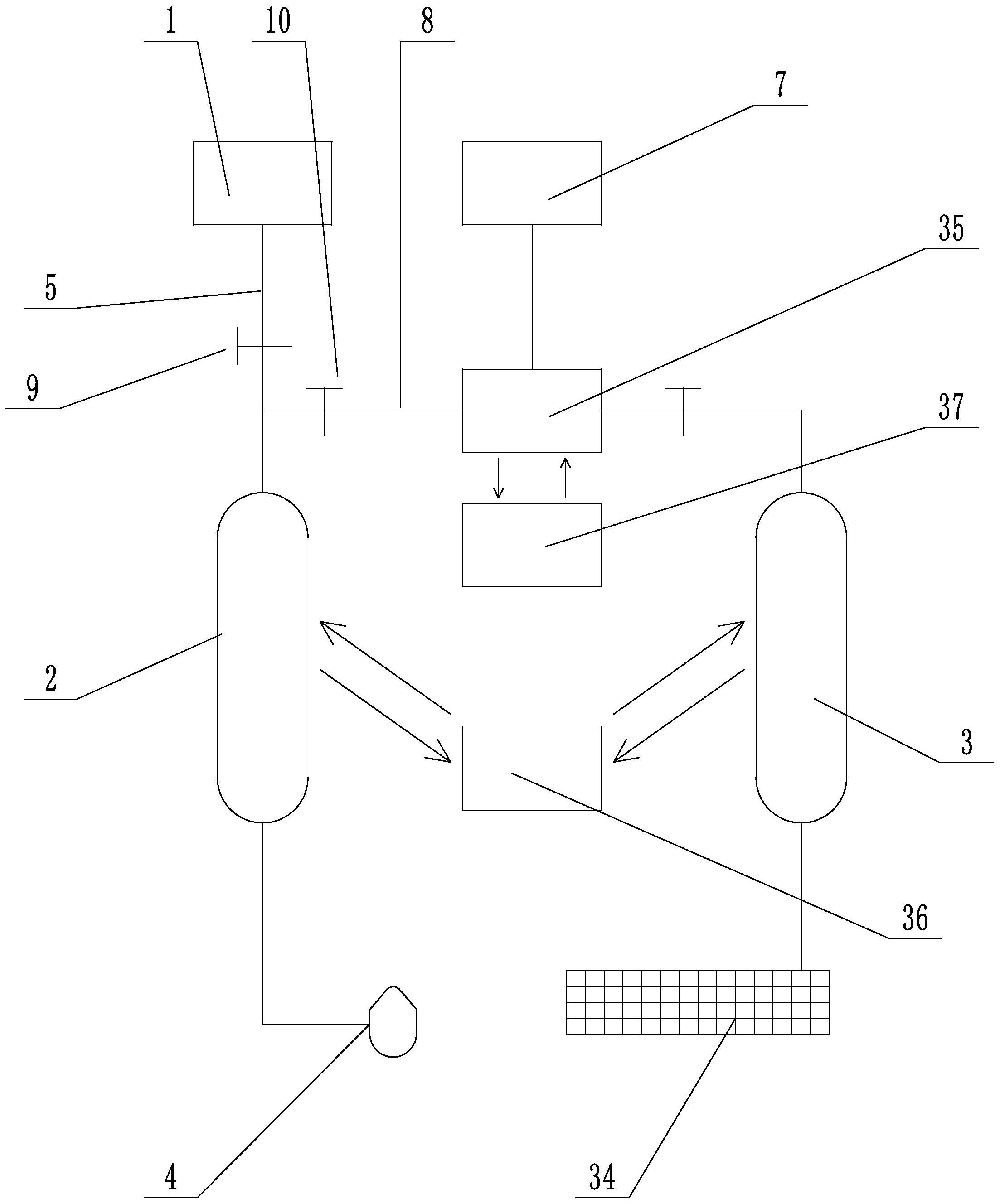 本发明公开了一种双气路多分离器制供氧系统,涉及制供氧系统技术领域;包括AB吸附塔、CD吸附塔、个体终端、弥散终端、第一气路连接管、车载气源、第二气路连接管、备用空压机、第一气路阀组、第二气路阀组、气压监测装置、氧气传感器、闭环控制系统等。系统优先利用车载压缩气源,经过两组吸附塔进行氮氧分离,从而提高车厢环境内氧气浓度,同时,在监测到车载压缩空气压力偏低、流量偏小或列车电力系统出现故障时,冗余压缩机气源自动开启,并经AB吸附塔分离输出高浓度氧气供个体终端使用。