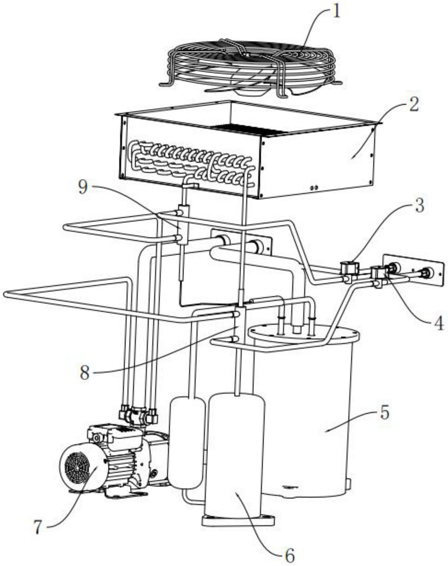 本实用新型公开了双热管激光冷水机,包括风机,风机的下方设有冷凝器,冷凝器的下方设有蒸发器,蒸发器的一侧设有压缩机,压缩机远离蒸发器的一侧设有水泵,压缩机的上方设有第二热管,冷凝器的下方设有第一热管,第一热管与第二热管的内部皆设有排气管与出口通管,排气管与出口通管的两端皆延伸至第二热管与第一热管的外部,第二热管与第一热管一侧的外壁上设有热水出口,热水出口下方的第二热管与第一热管外壁上设有冷水进口。本实用新型设计了双热管系统,对压缩机高温排气热量和冷凝器冷媒出口余热进行回收利用,对高温出水进行调温,无需通过加热棒的电加热来调温,节能环保,提高设备的可靠性。