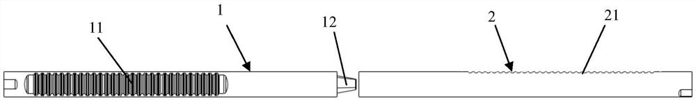 本实用新型公开了一种双小齿轮齿条,包括第一子齿条和第二子齿条,所述第一子齿条上设有第一齿部,所述第二子齿条上设有第二齿部,所述第一齿部与所述第二齿部位于不同的平面上,所述第一子齿条与所述第二子齿条的端头固定连接。本实用新型中将一根齿条拆分成两条子齿条,每条子齿条单独加工,每条子齿条上的齿部可以单独加工,减少了开发和生产的难度,降低了成本,同时也方便运输。