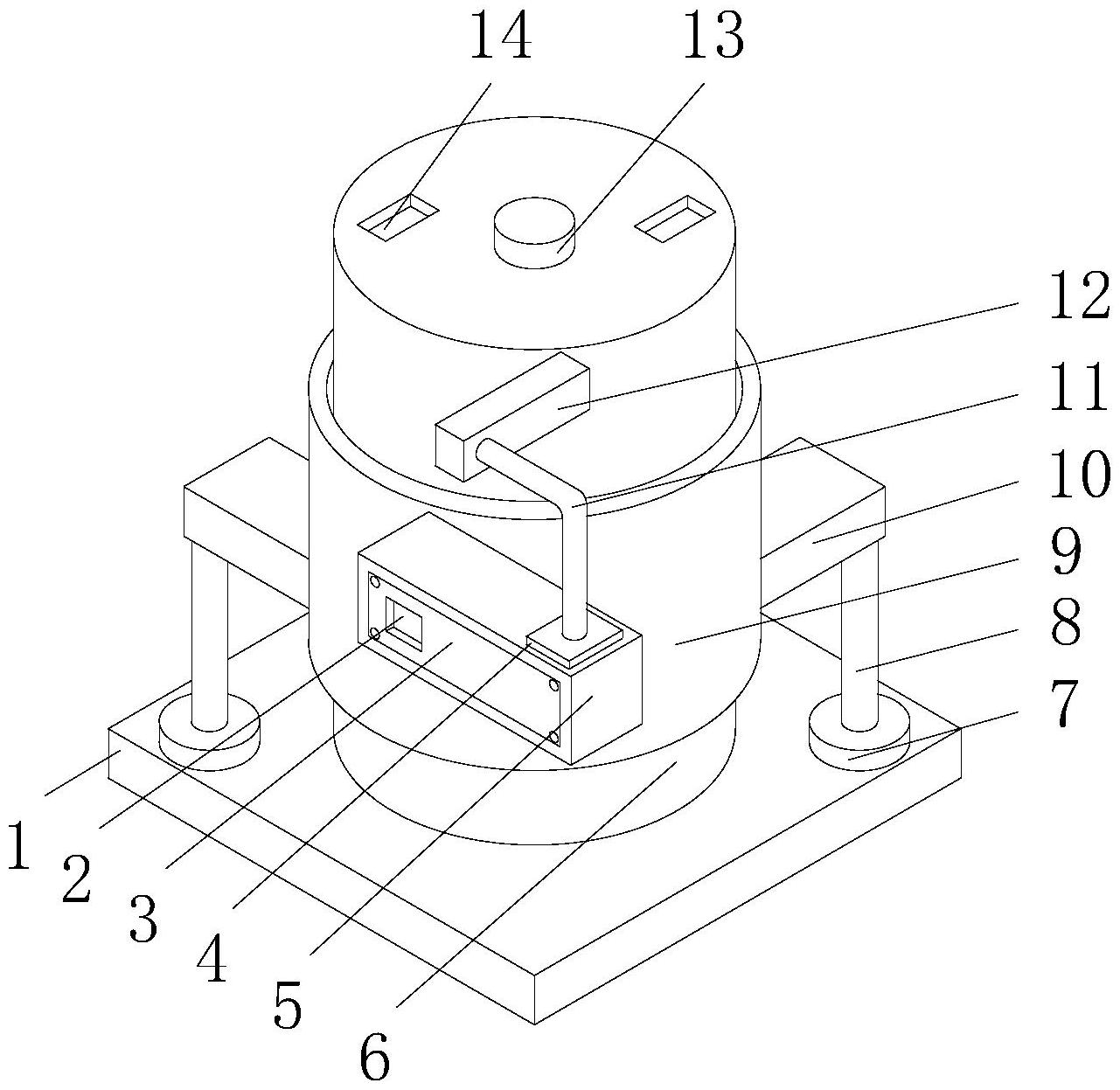 本实用新型公开了一种注塑用原料预热装置,包括底板和加热套,底板顶部的中端固定连接有物料箱,加热套的内表面固定连接有加热片,加热片的内侧与物料箱的外表面紧密接触,加热套的正面固定连接有加热箱,加热箱顶部的右侧固定安装有风机,风机的输出端固定连接有输风管。本实用新型通过加热片开启工作,加热片进行制造热量,由于加热片的表面与物料箱的表面接触,通过加热片制造热量不断对物料箱进行加热,通过物料箱的加热对内部原料进行加热,从而达到预热的目的,起到了快速预热的效果,通过风机开启工作,风机向加热箱内部抽取空气,空气首先与加热器接触进行加热,风机将加热后的空气输送至输风管的内腔。