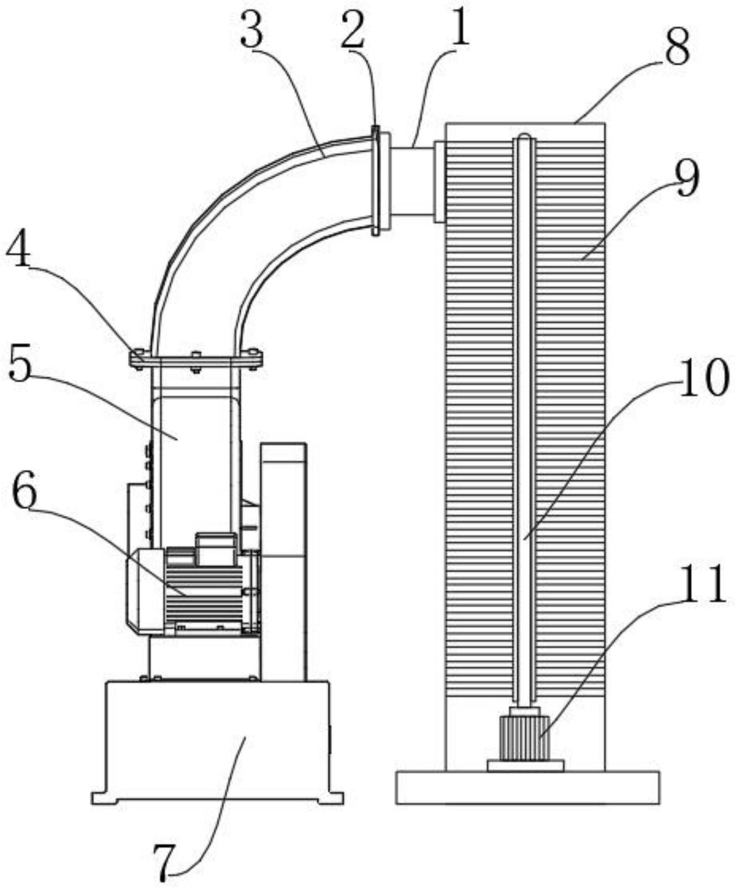 本实用新型公开了一种潜水推流器用除尘设备,包括推流器机壳,还包括:清扫装置,其设置在推流器机壳的内部,清扫装置上安装有驱动电机,驱动电机的输出端通过传动轴连接有清扫刷毛;除尘机构,其设置在推流器机壳的一侧,除尘机构上安装有除尘电机,主动轮的表面通过皮带连接有从动轮,从动轮的表面中心处通过旋转轴与设置在除尘机构内部的除尘风机相连接,所述除尘机构的上端安装有吸尘管道,吸尘管道与除尘机构之间为可拆卸式结构,吸尘管道的一端通过引尘管与推流器机壳的内部相连通。本实用新型通过设置有自动化清扫装置,可对推流器机壳内部灰尘进行清扫,灰尘扬起之后,可通过除尘机构将其及时快速排出,进而对机壳内部达到良好除尘效果。