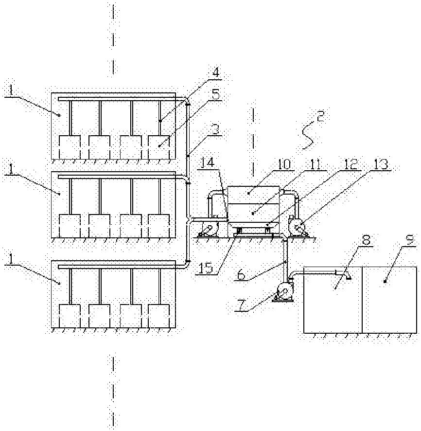 本实用新型涉及一种生产线二次除尘系统,包括设置在一个或多个加工车间外的一级布袋除尘设备,所述一级布袋除尘设备的进料管接入一个或多个加工车间内,并通过支管连接到加工车间内的各个生产设备上,若干个一级布袋除尘设备的下端出料口经送料管路运送至集料间,所述送料管路上设置有送料风机;或者,若干个一级布袋除尘设备的下端出料口经负压送料管和二级布袋除尘设备抽送至集料间。以此来解决车间较多、面积较大的生产厂区中粉尘得不到有效控制的问题。实施本实用新型的相关技术对厂区改造后,不管是加工车间内还是厂区通道上均无粉尘散落,避免厂区尘土飞扬,使厂区的生产作业更加清洁和文明。