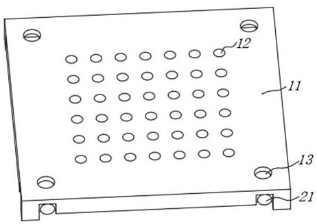 本实用新型涉及地垫技术领域,特别是为实现上述目的,本实用新型提供如下技术方案:一种易清洁的拼接组合地垫,包括若干主体,所述主体的侧壁设有若干滑槽,所述滑槽的开口处设有吸盘,所述吸盘朝向所述滑槽的开口方向;所述滑槽的底壁贯穿所述主体;装配时,两两所述主体的侧壁贴合,对应所述主体的侧壁处的所述吸盘相互连接;本实用新型通过设置吸盘来连接地垫的主体,减少设置卡扣拼接齿槽,方便清理,不会有灰尘残留,同时两两吸盘连接,强度较高,保证地垫连接的稳定性,不会出现上下晃动的,通过设置滑槽,将吸盘容置于滑槽内,防止吸盘损坏。