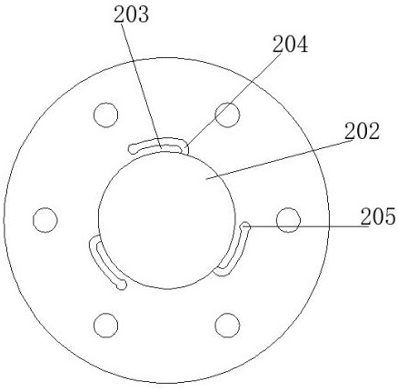本实用新型公开了一种可调夹头座,夹头座内开设有旋转主轴连接孔,所述旋转主轴连接孔的内壁上开设有若干凹槽,所述凹槽沿旋转主轴连接孔的圆周间隔设置,每个凹槽内均设置有弹片,所述弹片的一端与凹槽的内侧壁相连;所述夹头座上开设有若干沿旋转主轴连接孔径向方向延伸的调节孔,所述调节孔的数量与凹槽的数量相匹配,每个凹槽的外侧均设置有一个调节孔,所述调节孔为通孔,所述调节孔贯穿凹槽底部;所述调节孔内设置有按压件,所述按压件可沿调节孔移动,所述按压件用于推动弹片向旋转主轴连接孔内部移动。该夹头座能够微调旋转主轴连接孔与旋转主轴前端间的装配间隙,进而保证整个夹具的夹持精度,避免工件端面跳动较大。