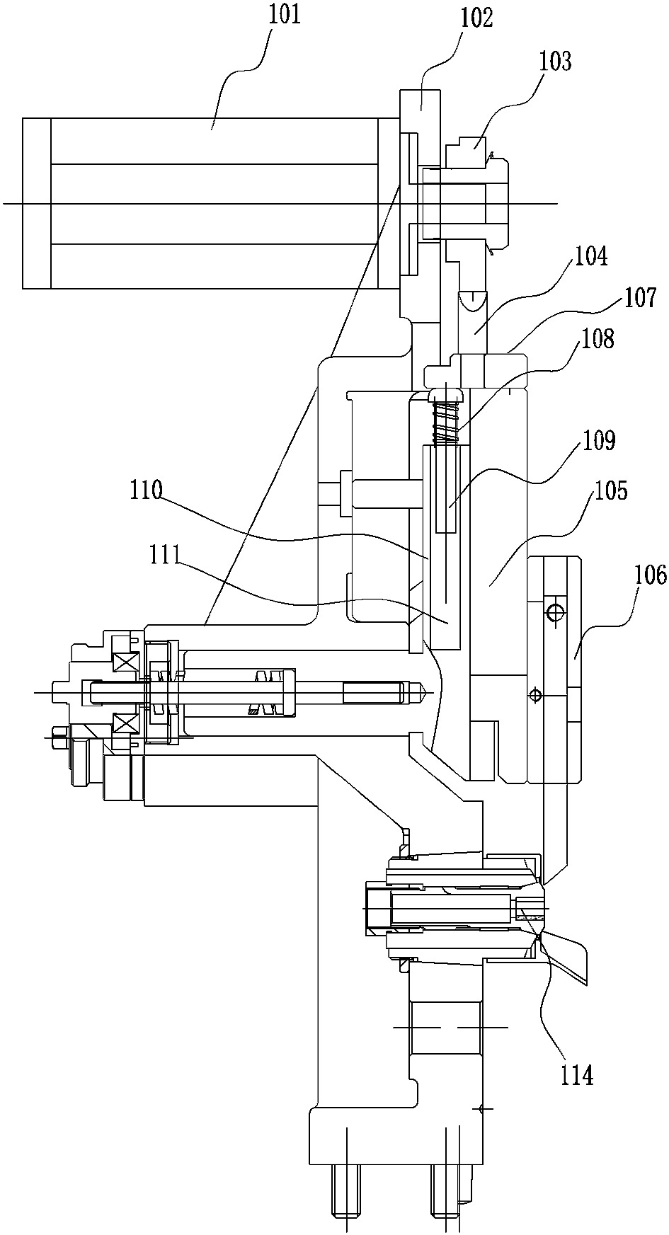 本实用新型公开了凸轮式纵切自动车床立刀架进刀装置,包括立刀架体和传动机构,立刀架体上安装有夹持工件的夹持部,传动机构包括伺服电机、凸轮、立刀架和弹性复位机构,伺服电机安装在立刀架体上,伺服电机的动力输出端安装有凸轮,立刀架通过弹性复位机构安装在立刀架体上,立刀架的另一端安装有夹持刀具的夹头,凸轮转动带动立刀架往夹持部的轴心移动。本实用新型的有益效果是:刀夹移动由伺服电机带动凸轮转动,然后由凸轮推动刀夹作进刀运动,刀夹的运动距离及精度由伺电机控制,从而保证了刀具的进刀精度,而且整个传功机构拆装方便,省去了大量的部件装配时间和成本,用户使用时更加简单、方便。
