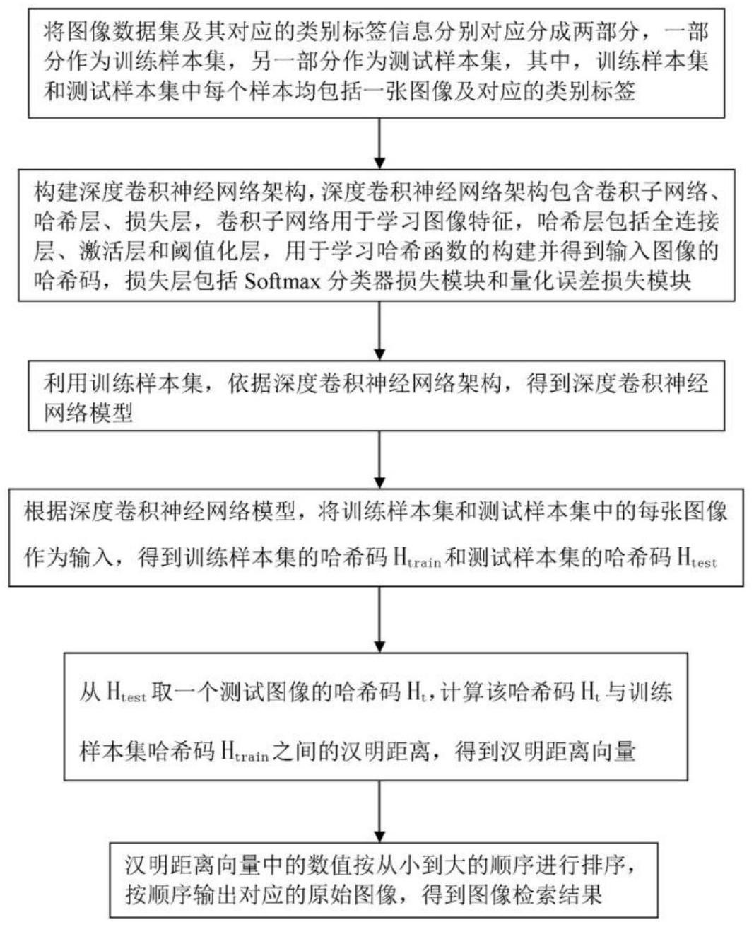 本发明涉及一种基于深度学习和哈希的图像检索方法,利用深度卷积神经网络强大的学习能力,提取图像深层特征,克服现有技术中利用图像底层特征而导致特征表达能力不强、检索精度低的问题;并引入哈希层构造哈希函数,将图像深度特征的学习和哈希函数的构造在同一过程中完成,挖掘图像特征与哈希函数内在关系,大大提高图像检索准确率;将量化误差的损失加入到深度卷积神经网络的损失层,增强了哈希码的表达能力,通过Softmax分类器损失模块和量化误差损失模块,有效降低哈希函数中的二值化造成的量化误差,进一步提高图像检索的准确率。