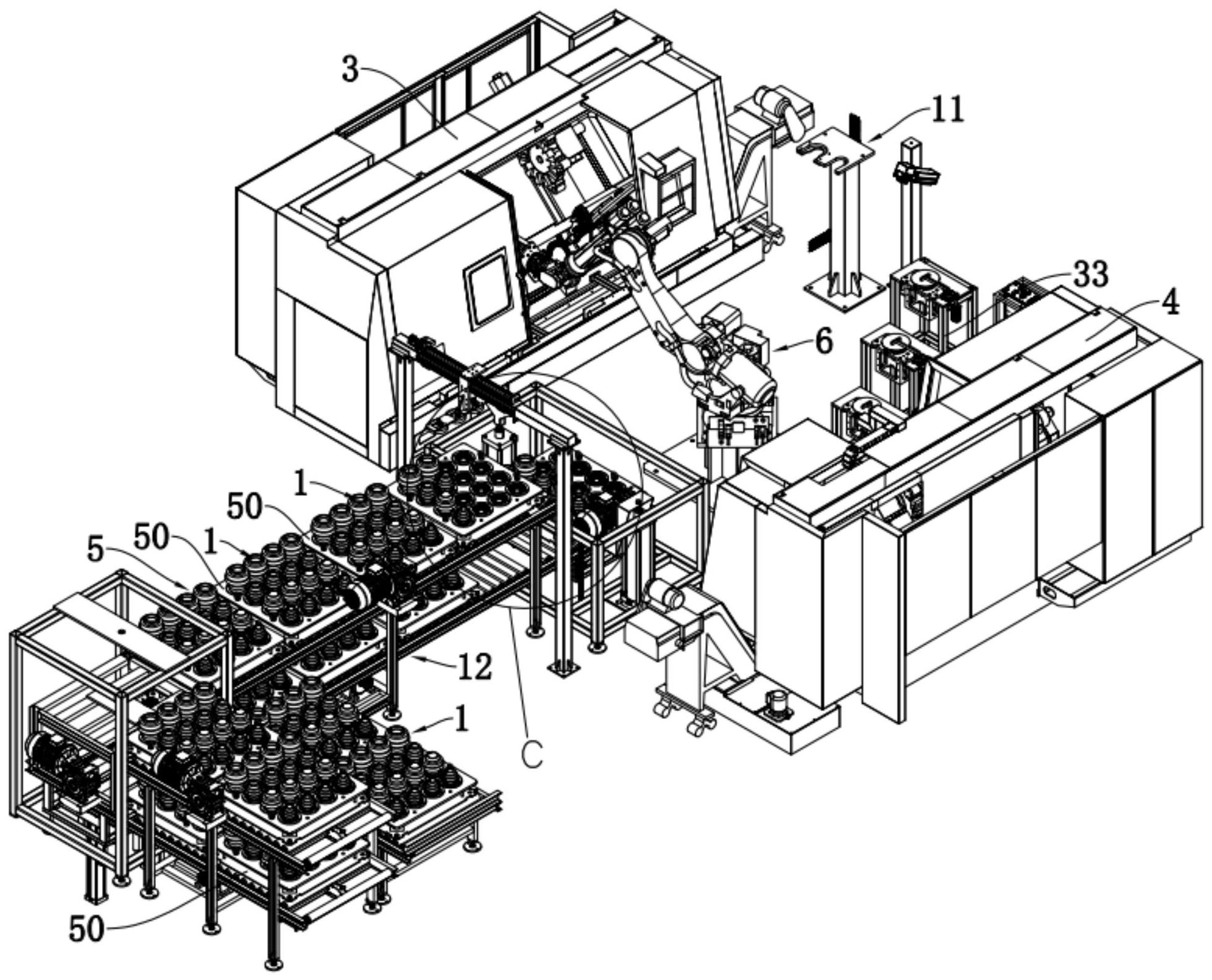 本实用新型涉及自动化加工领域,公开一种套类零件加工工作站,包括第一数控车床、第二数控车床、进料装置、机械臂、换向器和出料装置,本实用新型的一种套类零件加工工作站,机械臂能够将进料装置抓取的待加工调模丝母依次放入第一数控车床与第二数控车床的夹具内,从而依次完成调模丝母A侧与B侧的金加工。第二抓取部能够在第一抓取部装料前取下第一数控车床或第二数控车床已经加工完成的工件,从而提升加工效率。通过换向器,能够让单个机械臂的抓取点从调模丝母的A侧切换至B侧,不仅能降低机械臂的数量及设备安装成本,还能进一步提升加工效率。工作站在运行过程中,无需人工干涉,不仅提升了安全性,还能使整个加工流程更加高效。