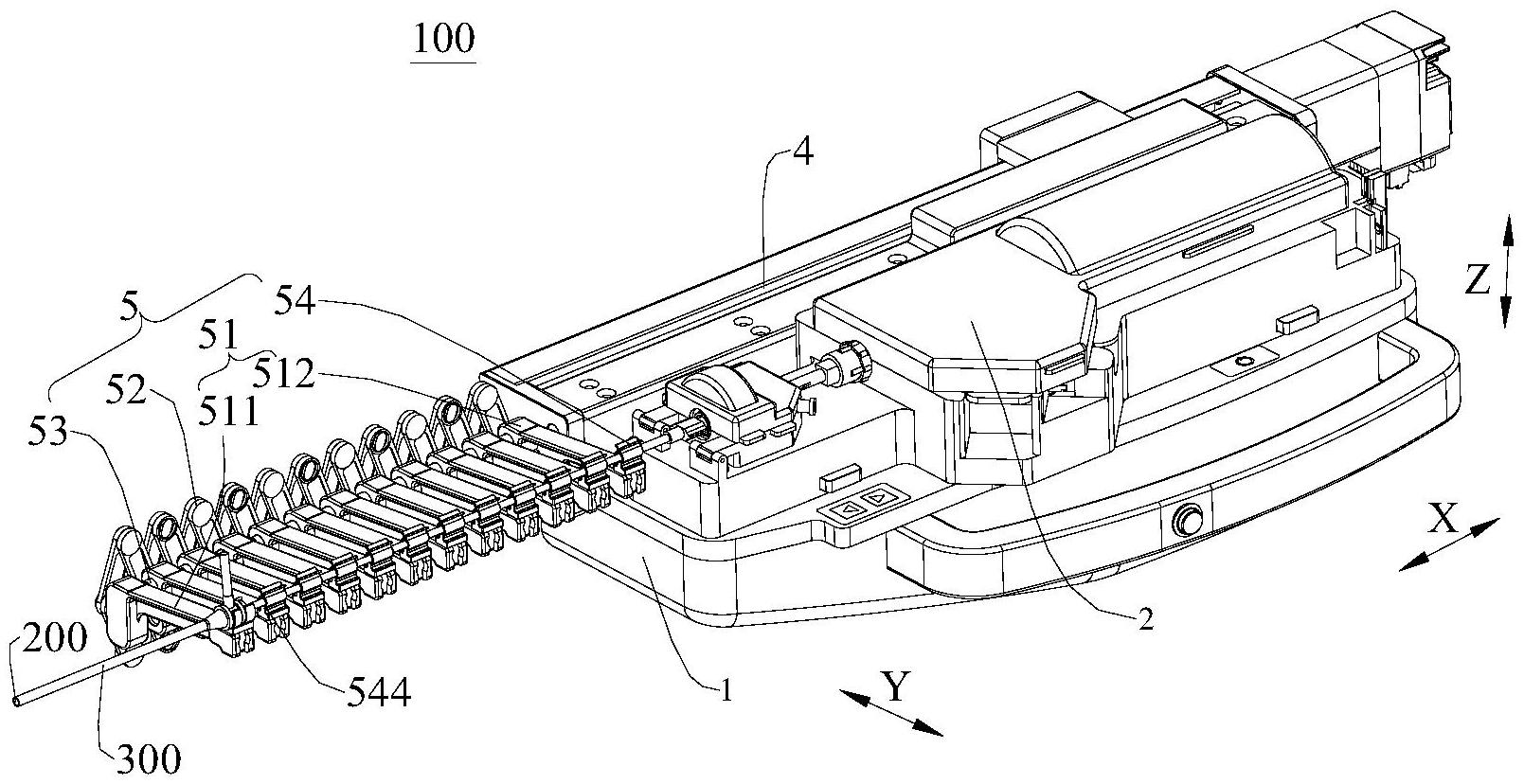 本实用新型公开了一种进给支撑模块、执行装置。进给支撑模块包括:滑柱;支撑架,支撑架设在滑柱上且至少两个,所有支撑架中位于一端的支撑架为第一支撑架且固定连接在滑柱上,除第一支撑架外其余支撑架上均设有滑孔,带滑孔的支撑架通过滑孔可滑动地套在滑柱上;限程组件,限程组件与至少两个支撑架相连;支撑导引件,至少两个支撑架上设有支撑导引件,支撑导引件在支撑架上可拆卸,支撑导引件上设有用于支撑细长物体的导槽。该进给支撑模块使得细长物体不易弯折,同时方便操作。通过将支撑导引件可拆卸地连接在支撑架上,可方便拆装、更换新的支撑导引件,提高了进给支撑模块的实用性。