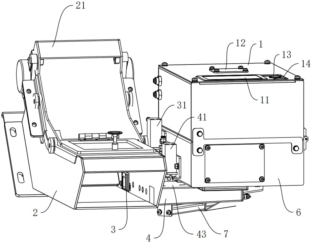 本实用新型公开了一种谷物白度在线检测装置,涉及谷物检测技术领域,旨在解决人工抽样测定频率较低;由于人为因素、操作方法等差异会导致测定结果存在偏差的问题。其技术方案要点是,包括进料仓、白度测定箱、开设在进料仓顶璧上的进料口、连接于进料仓侧壁与白度测定箱间的进料通道以及出料通道,白度测定箱内设置有检测灯、基准卡、检测窗口,白度测定箱内设置有驱动组件;进料通道的外底壁上设置有进气嘴。谷物被吹至检测窗口下,等待检测,通过驱动组件作用于检测灯移动,分别读取基准卡和检测窗口处原料的数值进行白度计算,测定频率较高,且为自动化,节省人工,具有恒压和自检功能,将外界不良影响因素降至最低,提高白度测定的可靠性。