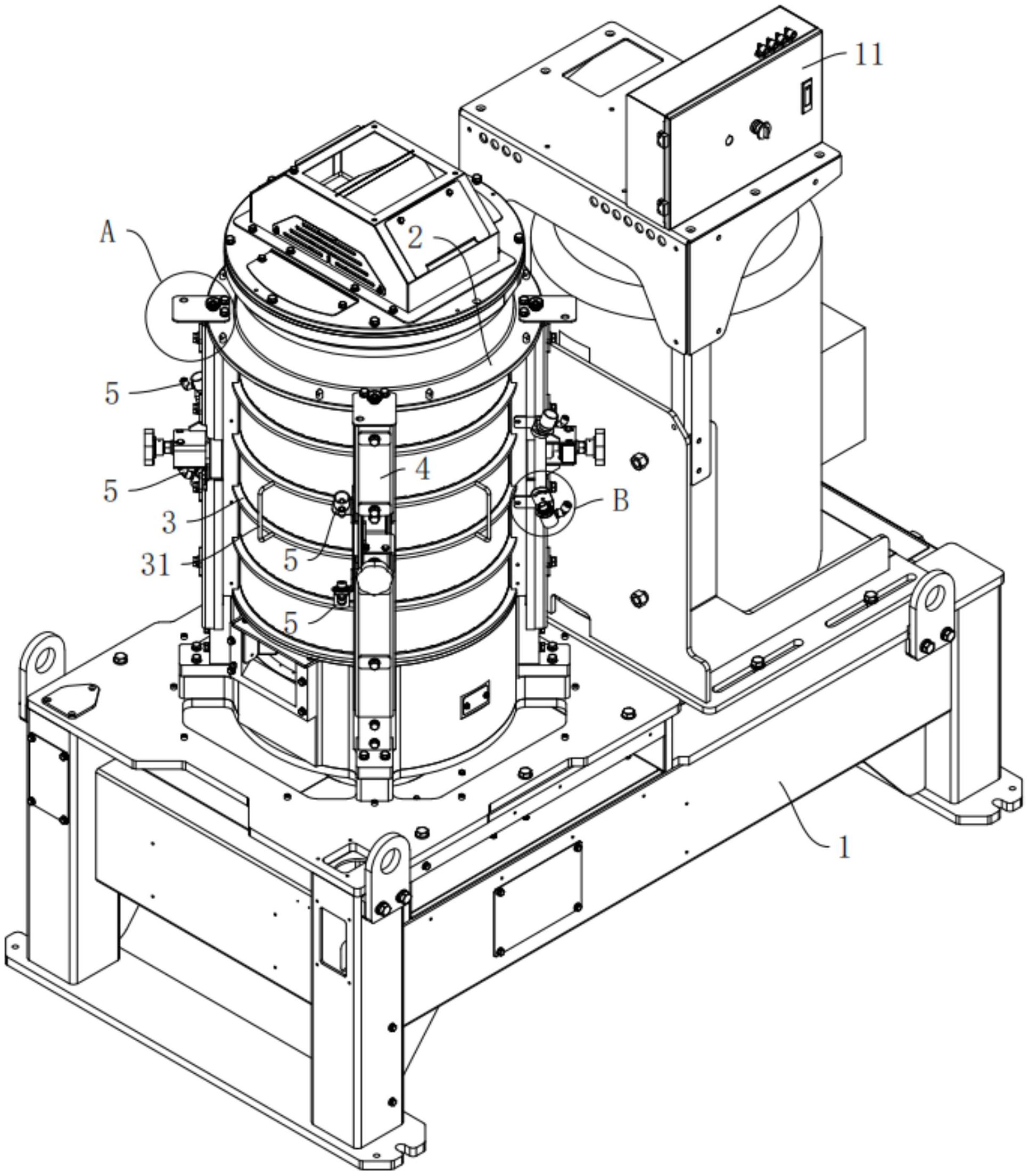 本实用新型公开了一种粮机内部的自动定时脉冲除糠装置,涉及粮食加工技术领域,旨在解决糠粉的堆积会造成筛网堵塞,由于应被排风系统吸走的糠粉一直在机器内部无法排出,内部摩擦力增大,导致粮机主电机电流升高,加工精度变差的问题。其技术方案要点是,包括工作台、设置于工作台上的机体以及设置在机体上的筛网,机体的圆周侧面上周向等距间隔设置有若干立柱,每个立柱上均设置有若干真空发生器,立柱上设置有用于固定真空发生器的固定组件,工作台的顶面上设置有控制真空发生器的电控箱。自动定时地对机器内部易堆积糠粉的位置喷射脉冲高压气体,防止糠粉的集结和糠团的形成,可有效避免主电机电流增高带来的加工精度变差和能耗增加问题。