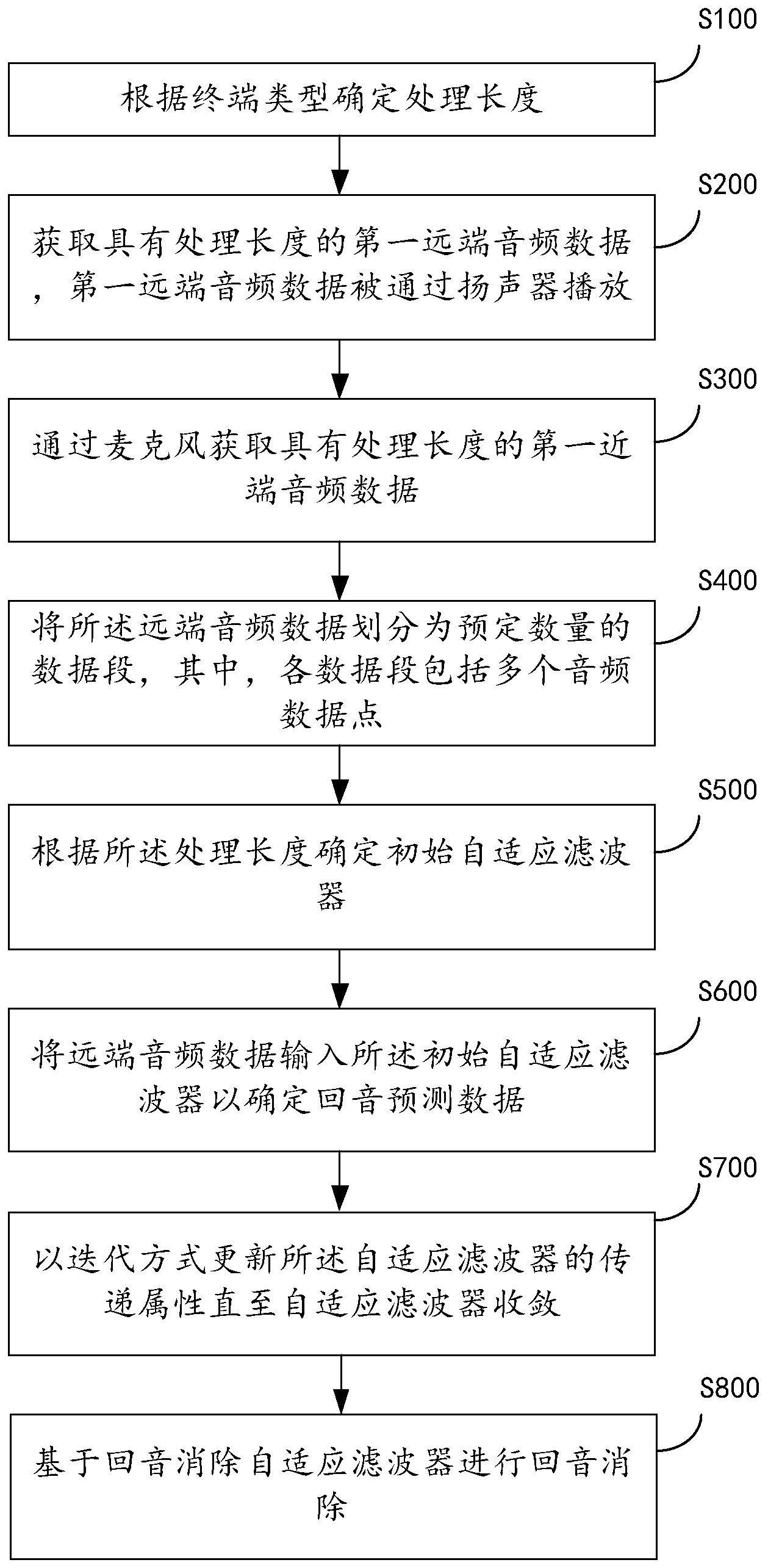 本发明实施例公开了一种回音消除方法、计算机可读存储介质和电子设备。所述方法通过获取终端类型确定处理长度,将具有处理长度的远端音频数据送入自适应滤波器,获得回音预测数据;通过麦克风获取具有处理长度的近端音频数据,使用远端音频数据估计回音预测数据,并在消音器中去除回音预测数据,从而达到了消除回音的效果。为适应不同的终端类型,将远端音频数据划分为预定数量的数据段,其中,各数据段包括多个音频数据点,同时,按照平台类型调整自适应滤波器的长度,通过远端音频数据与自适应滤波器进行滤波,使得回音消除方法能够适应在不同的平台应用、并且更加有效地消除不同平台下的回音,从而提升了用户的体验。